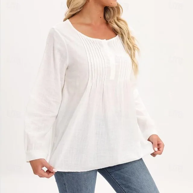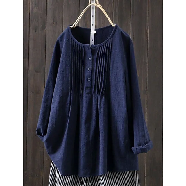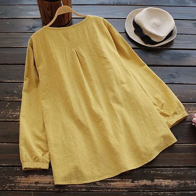 Linen Shirt Shirt Blouse Women’s White Yellow Pink Solid Color Button Street Daily Fashion Shirt Collar Cotton Linen Regular Fit M