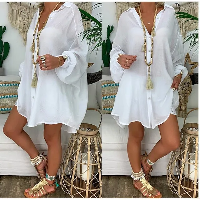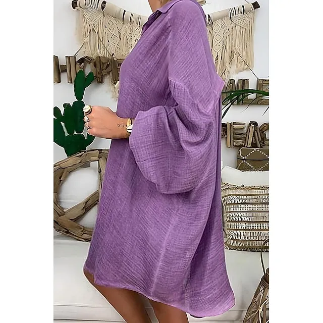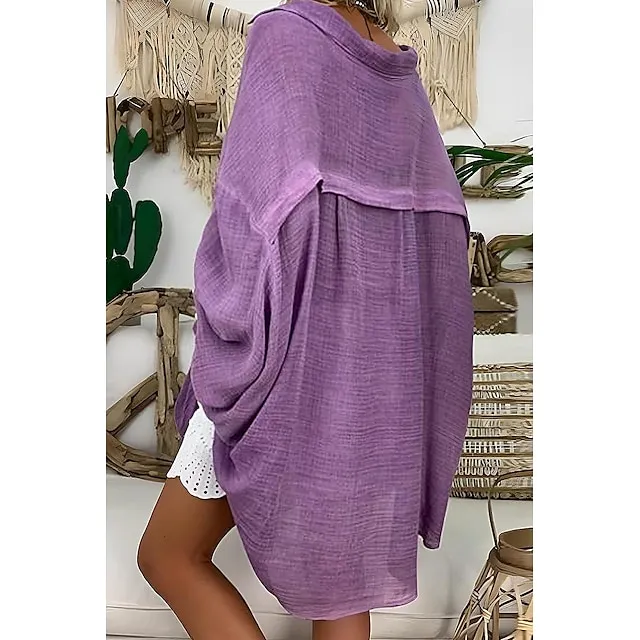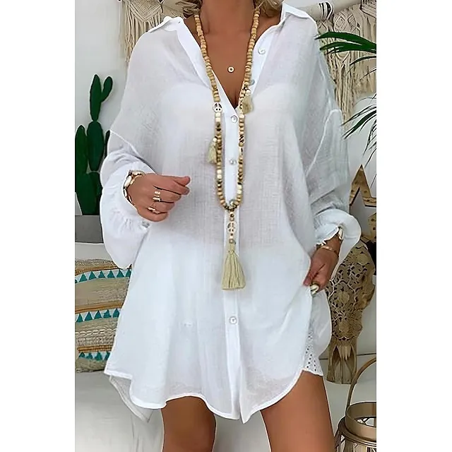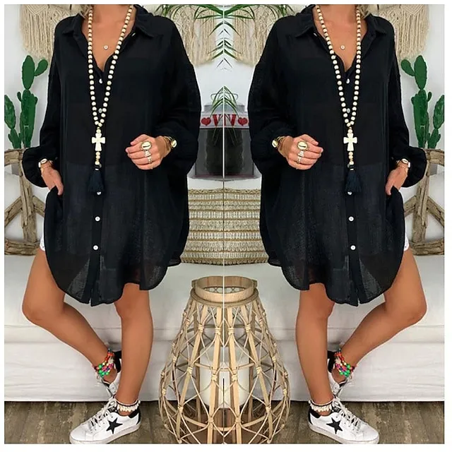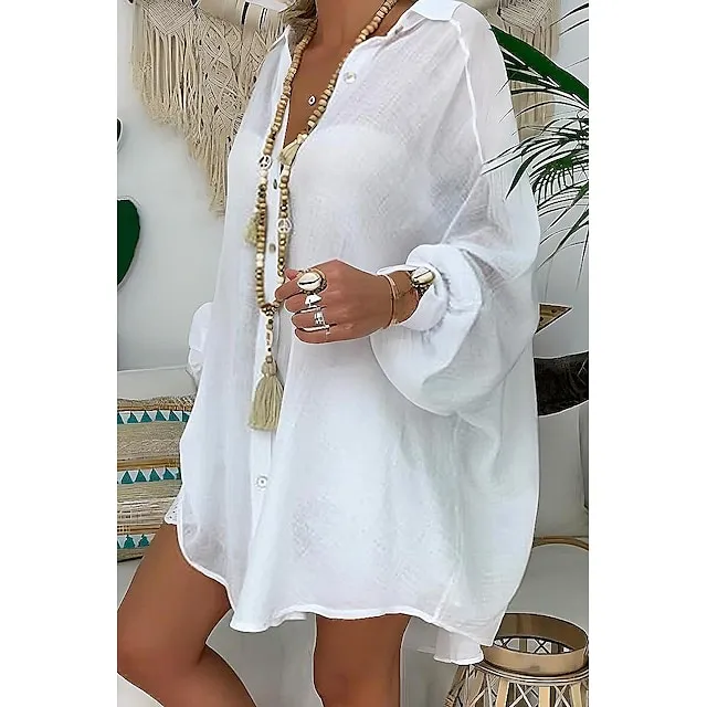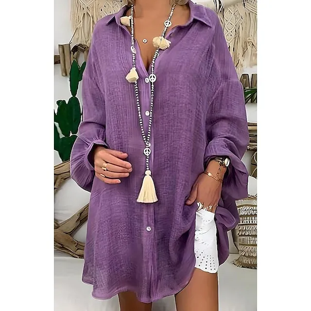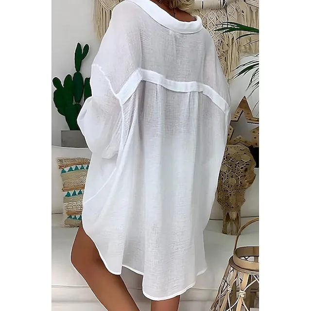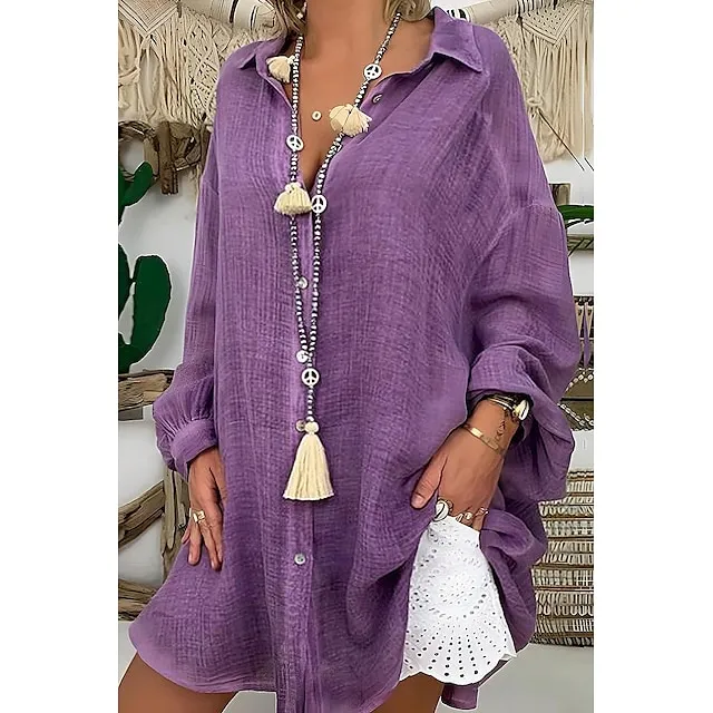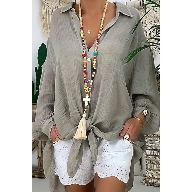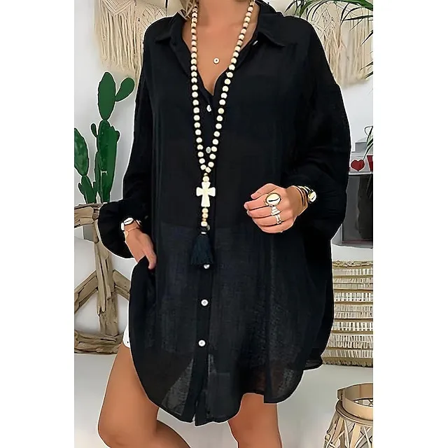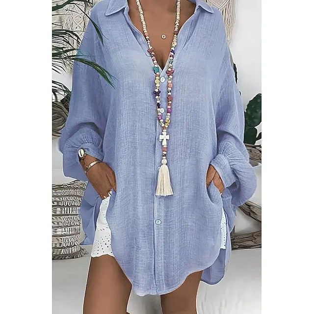 Linen Shirt Shirt Tunic Shirts Blouse Women’s Black White Blue Solid Color Button Long Street Daily Fashion Shirt Collar Cotton Linen Regular Fit S
