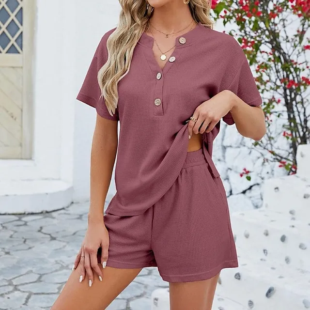 Set Women’s Black Army Green Red Solid Color Button 2 Piece Street Daily Fashion Round Neck S