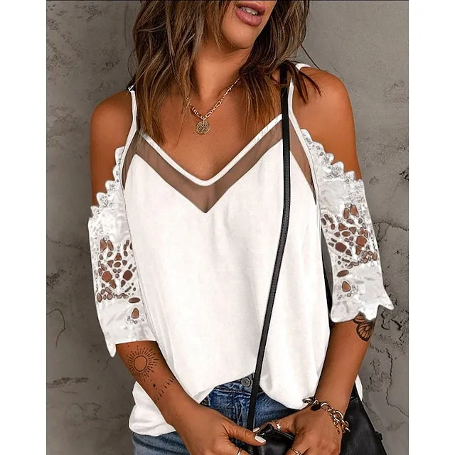 Women’s Shirt Blouse Plain Casual White Blue Lace Patchwork Long Sleeve Fashion V Neck Regular Fit Spring & Fall
