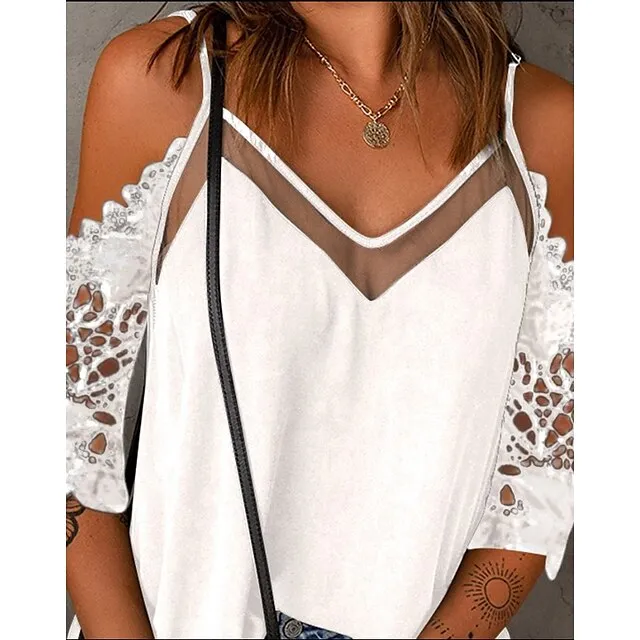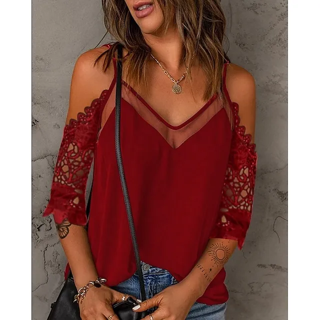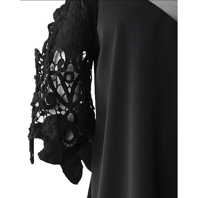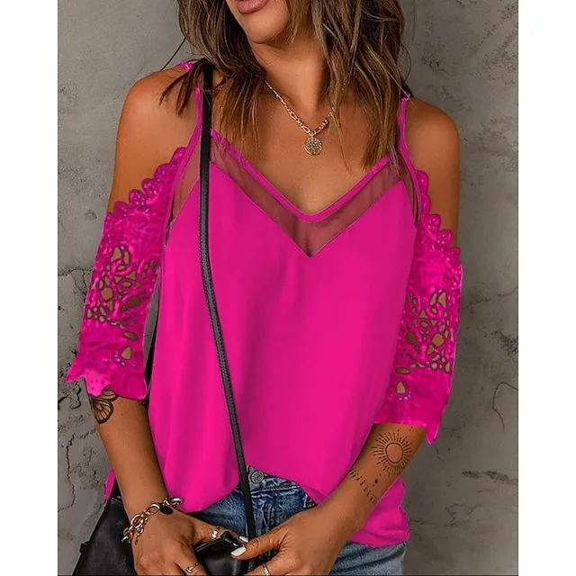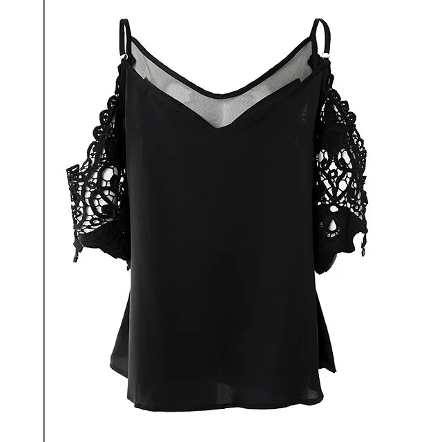 Shirt Blouse Women’s Black White Pink Solid Color Lace Cut Out Street Daily Fashion V Neck S