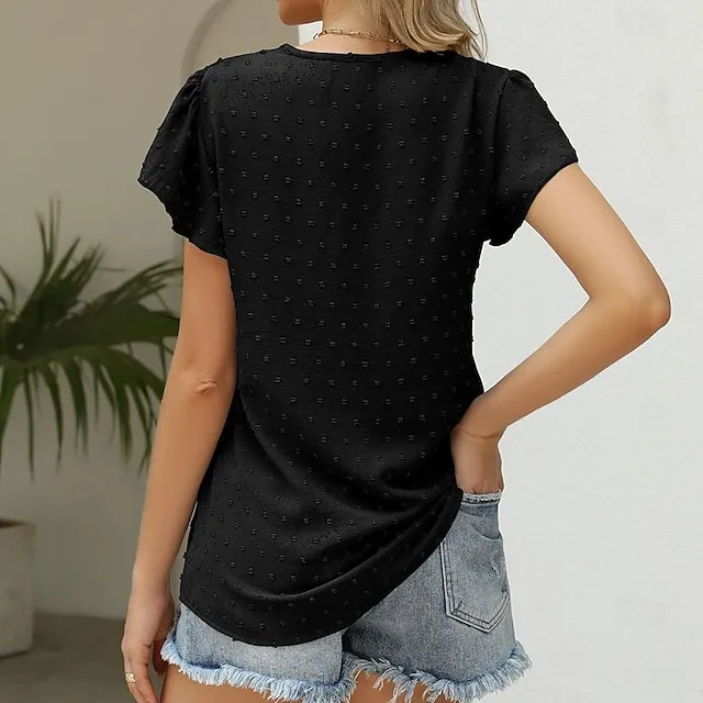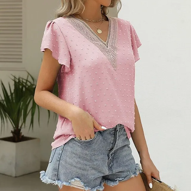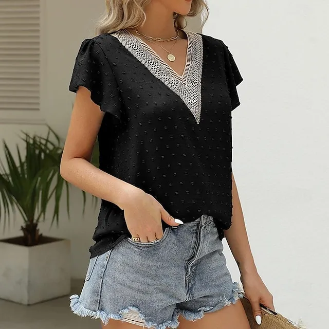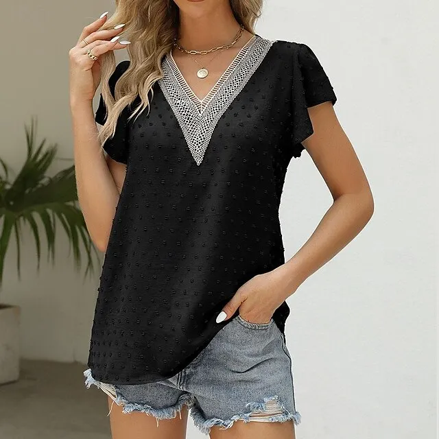 Women’s Shirt Blouse Eyelet top Black White Pink Plain Lace Zipper Half Sleeve Holiday Weekend Basic Streetwear V Neck Regular S