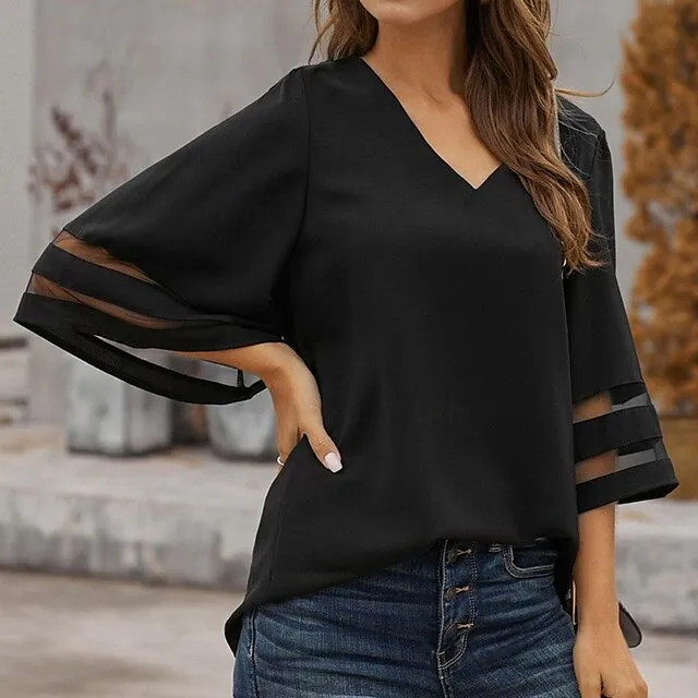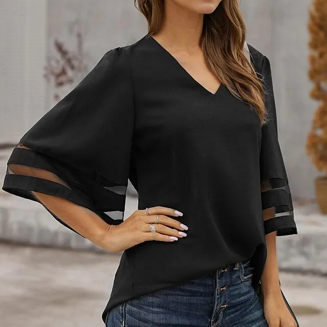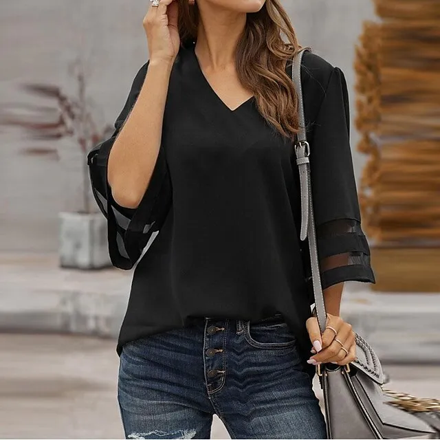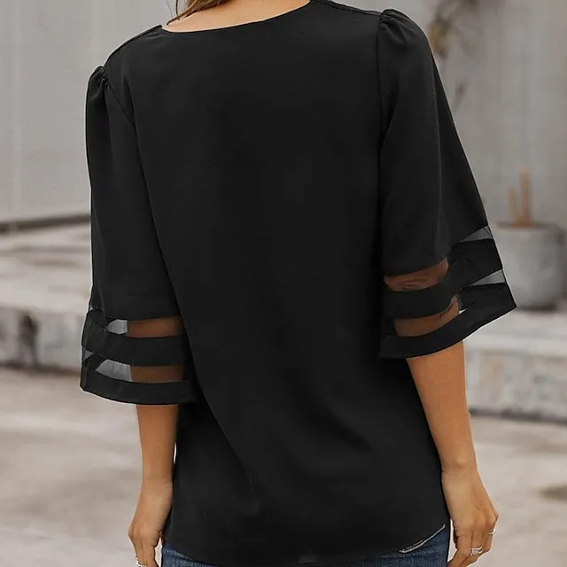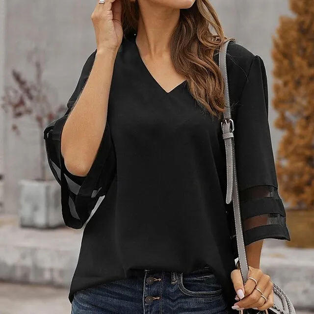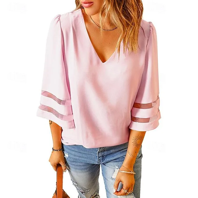 Shirt Blouse Women’s Black White Pink Solid Color Mesh Street Daily Fashion V Neck S