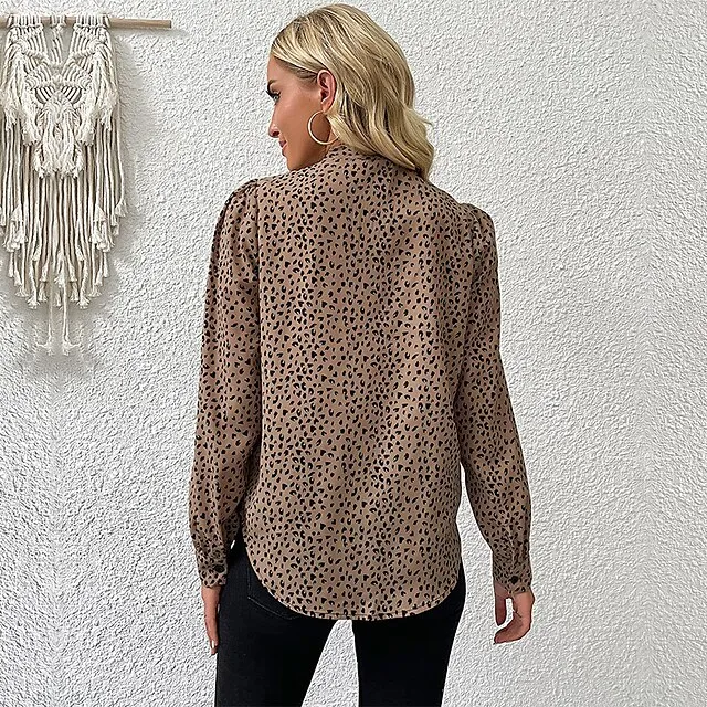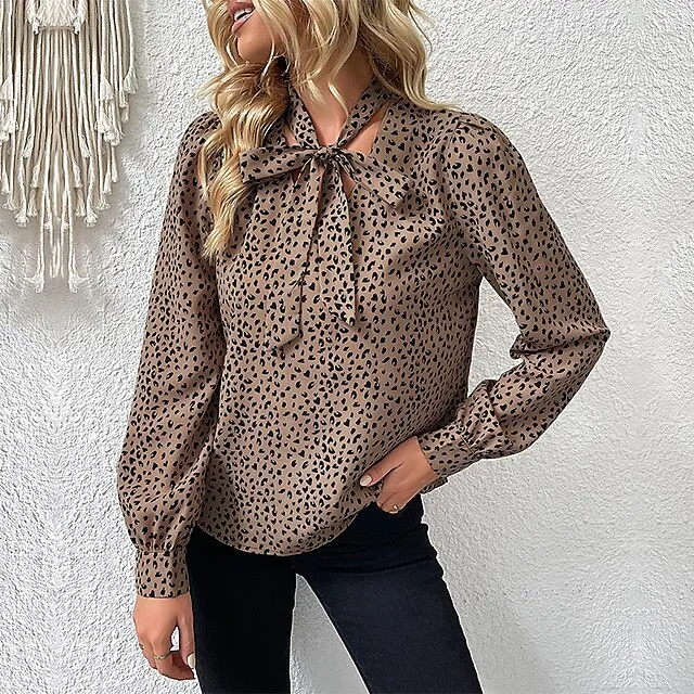 Shirt Blouse Women’s Khaki Leopard Print Lace up Printing Street Daily Fashion Daily V Neck Regular Fit S