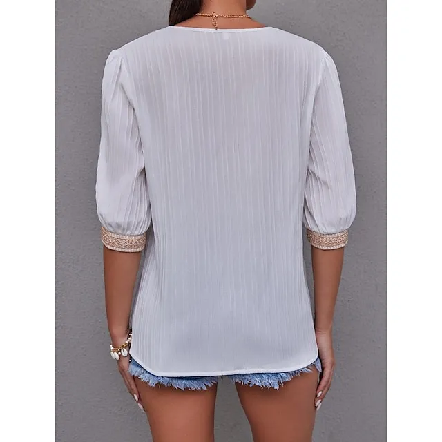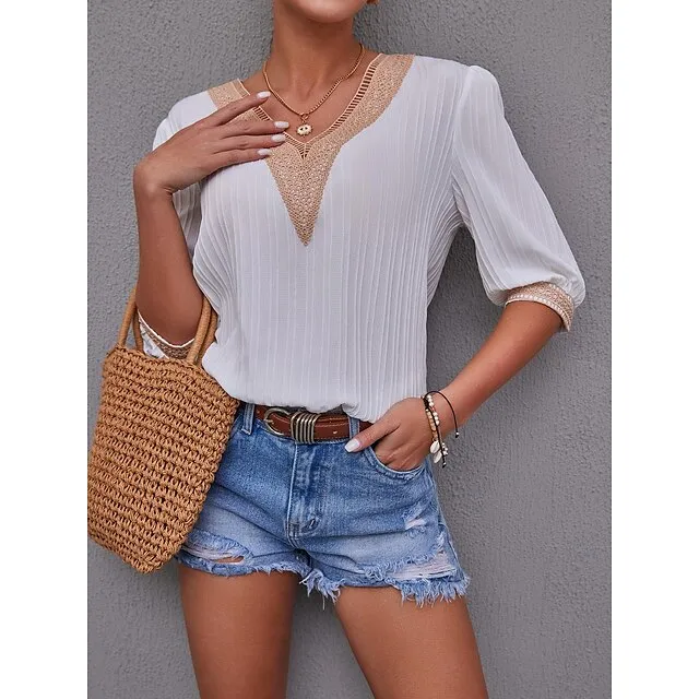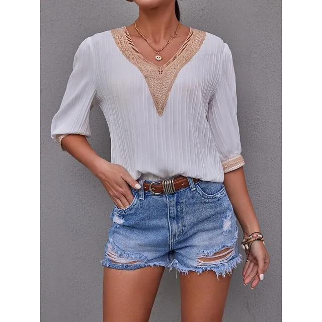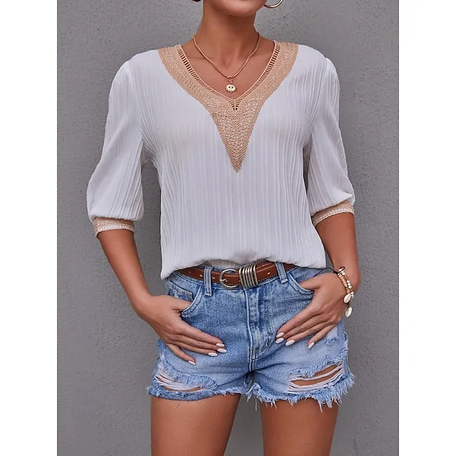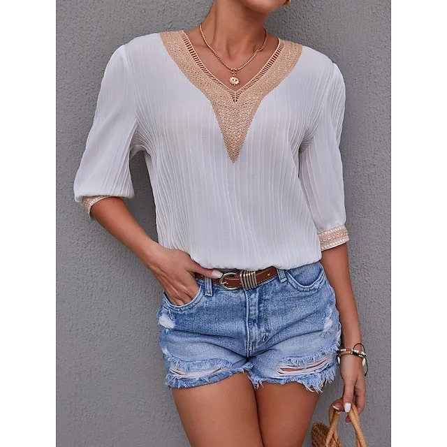 Women’s Shirt Blouse Plain Casual White Blue Lace Patchwork Long Sleeve Fashion V Neck Regular Fit Spring & Fall