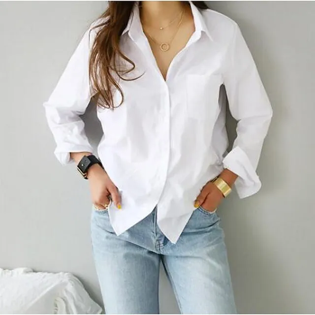 Shirt Blouse Women’s White Solid Color Button Pocket Daily Basic Shirt Collar Regular Fit M / M