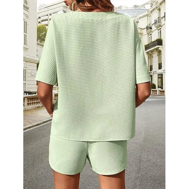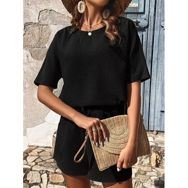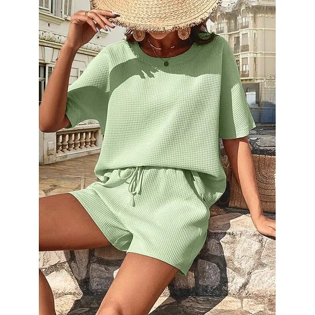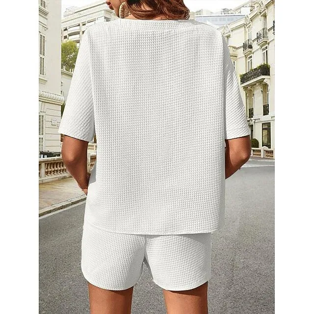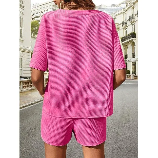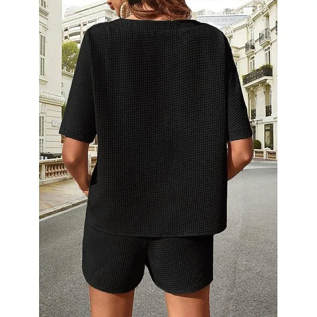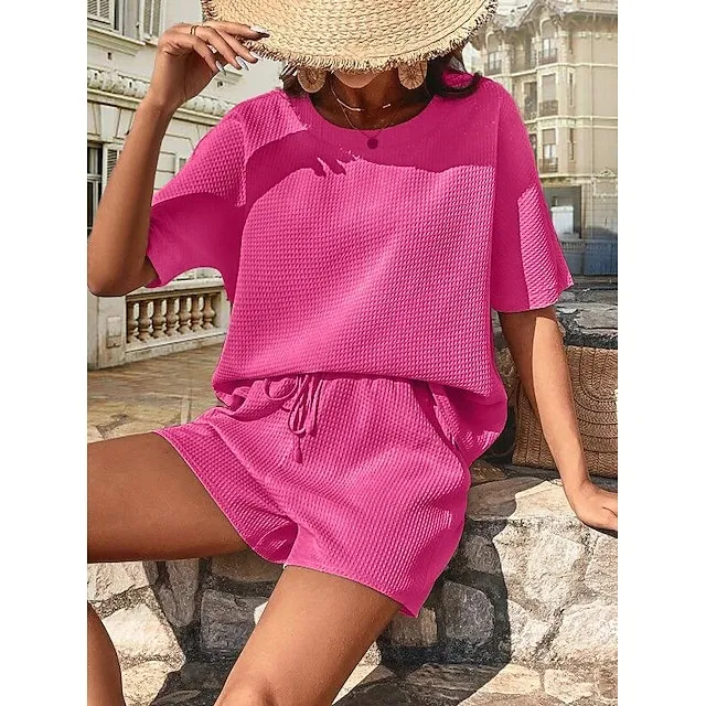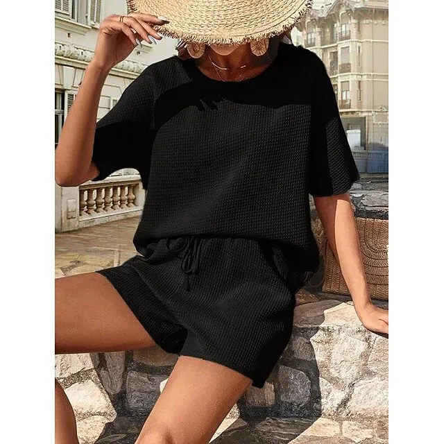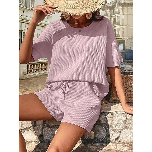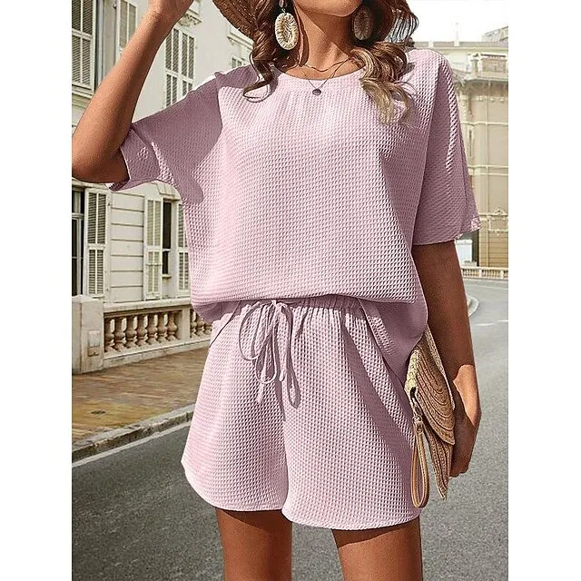 T shirt Tee Set Women’s Black White Pink Solid Color Drawstring 2 Piece Street Daily Fashion Round Neck Regular Fit S