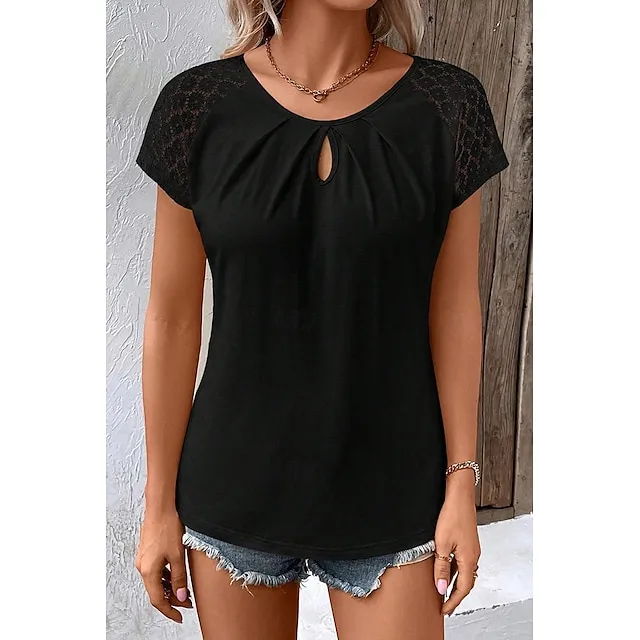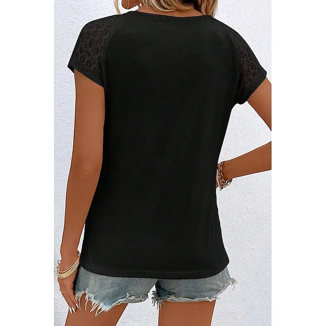 T shirt Tee Women’s Black White Solid Color Lace Street Daily Fashion Round Neck S