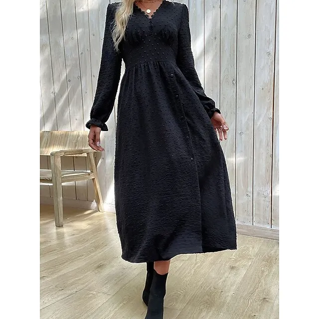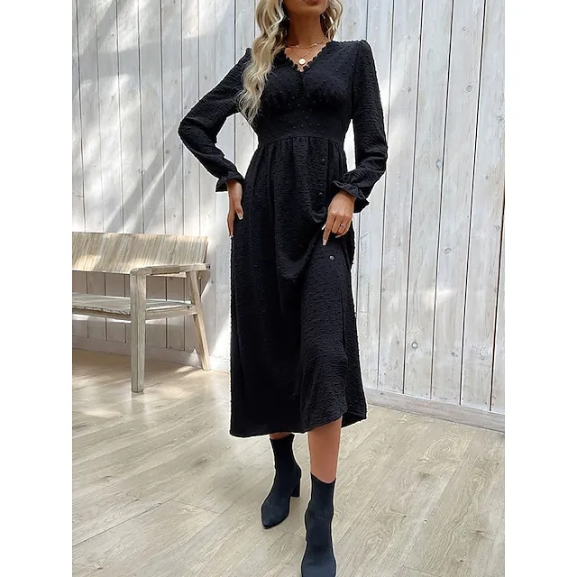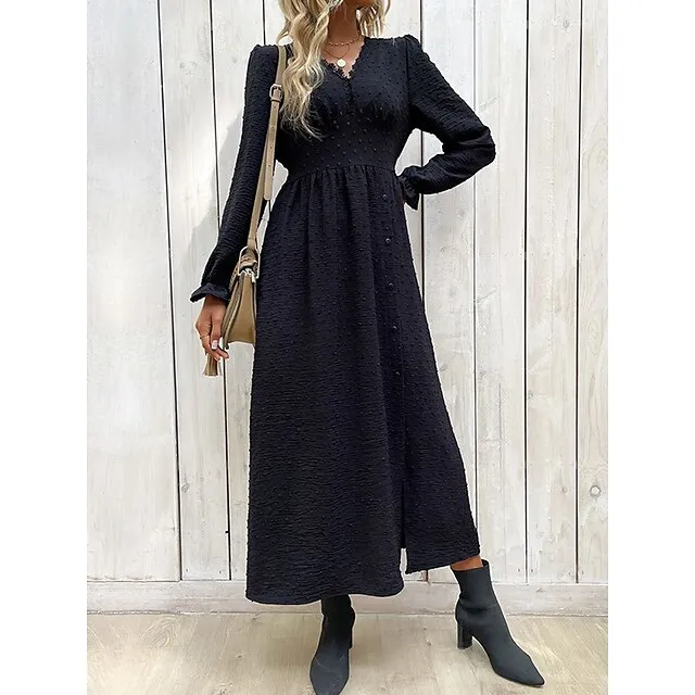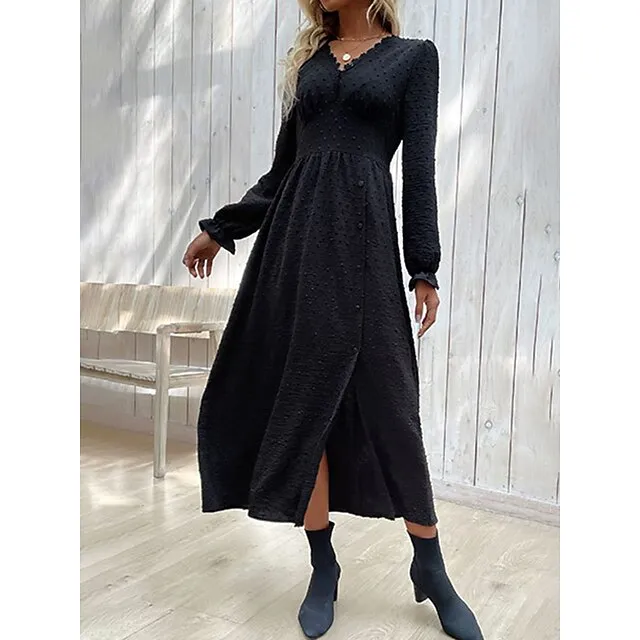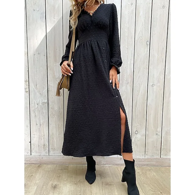 Women’s Black Dress Casual Dress Winter Dress Midi Dress Split Street Vacation Streetwear V Neck Long Sleeve Loose Fit Black Color S M L XL Size