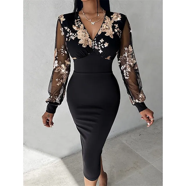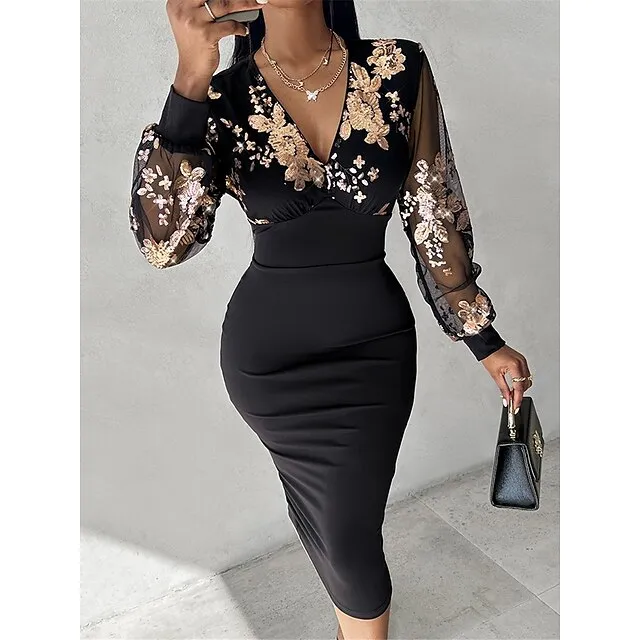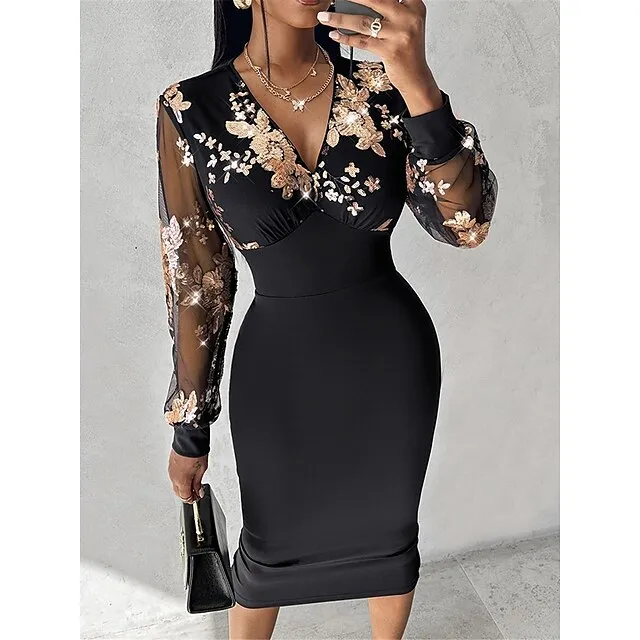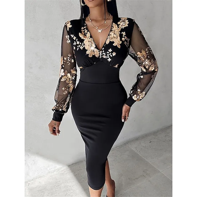 Women’s Black Dress Golden Floral Lace Dress Sequin Party Midi Dress Long Sleeve Sequins Spring V Neck Wedding Guest S M L XL XXL 3XL