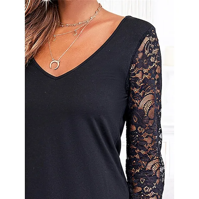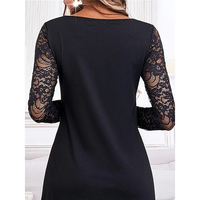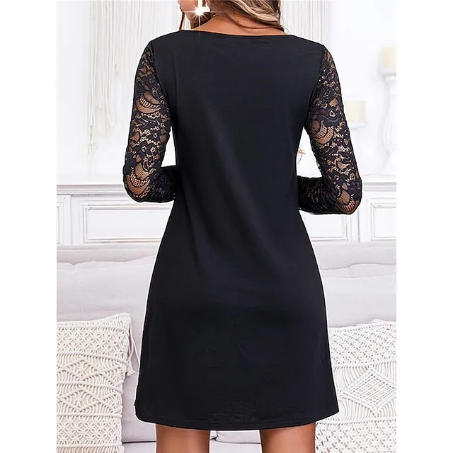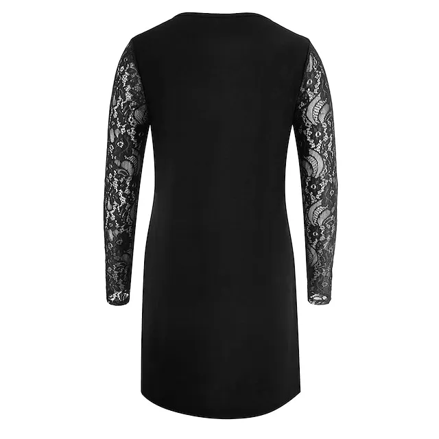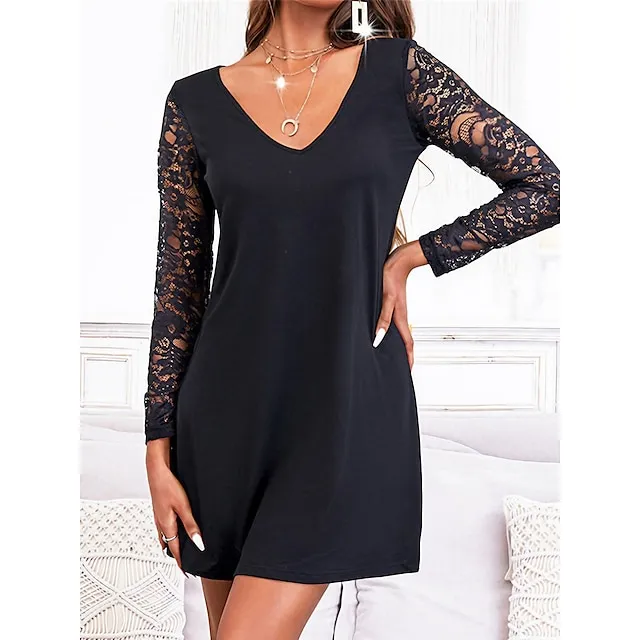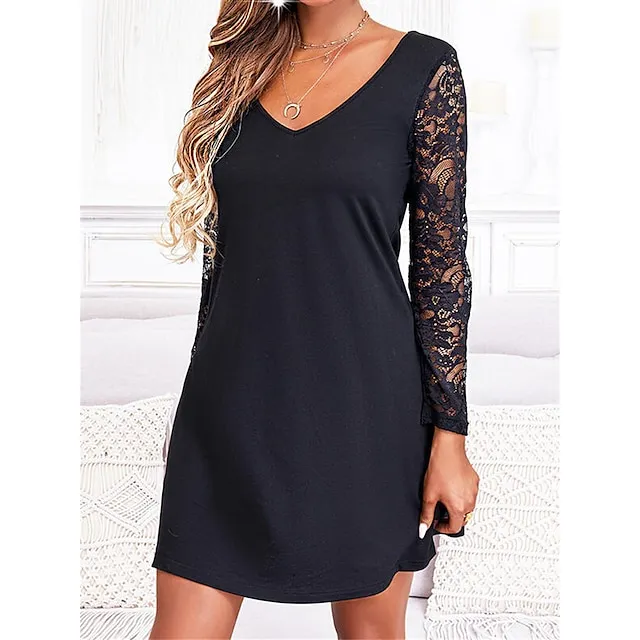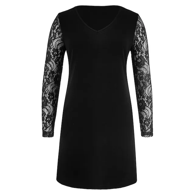 Women’s Black Dress Party Dress Lace Dress Mini Dress Black Long Sleeve Pure Color Lace Spring Fall Winter V Neck Fashion Winter Dress Wedding Guest Vacation 2023 S M L XL XXL 3XL