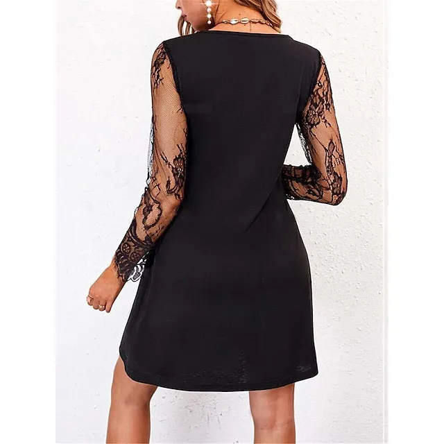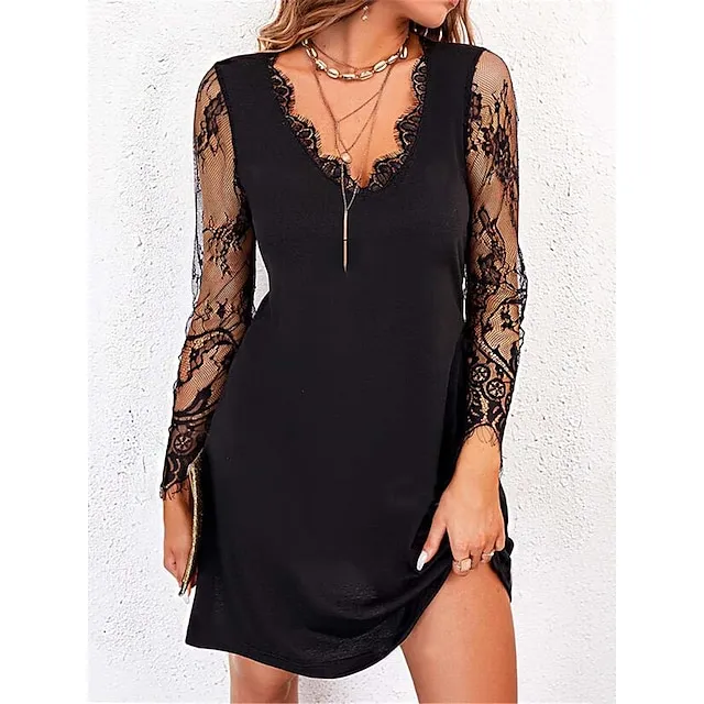 Women’s Black Dress Sequin Dress Party Dress Lace Dress Mini Dress Black Long Sleeve Pure Color Lace Spring Fall Winter V Neck Fashion Winter Dress Wedding Guest