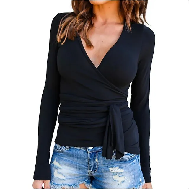Women’s Black Gray Solid / Plain Color Knotted Street Daily Daily V Neck Regular Fit S