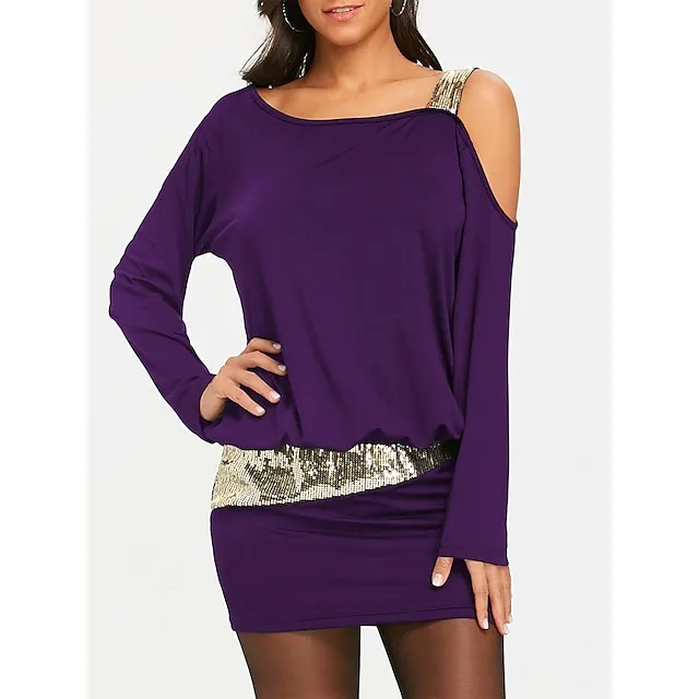 Women’s Black Sequin Dress Party Dress Sparkly Dress Little Black Dress Sexy Dress Black Mini Dress Wine Purple Long Sleeve Color Block Fall Winter Off Shoulder Fashion