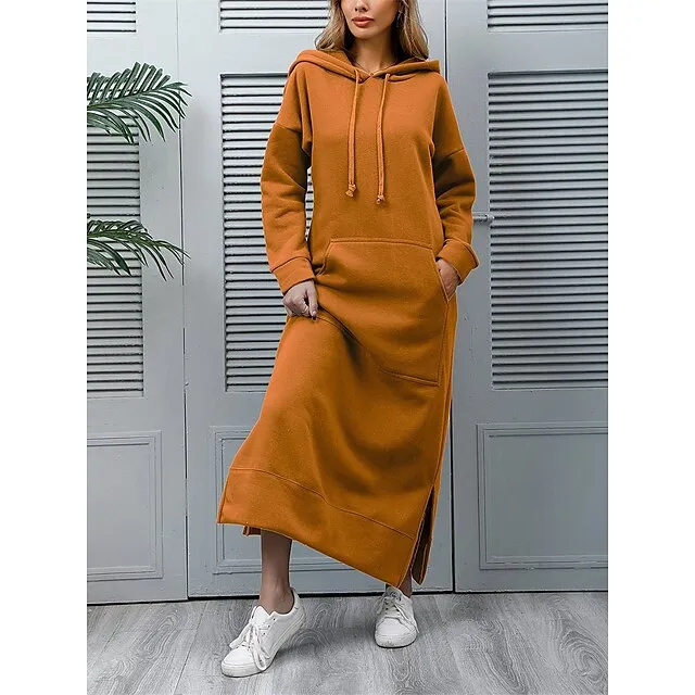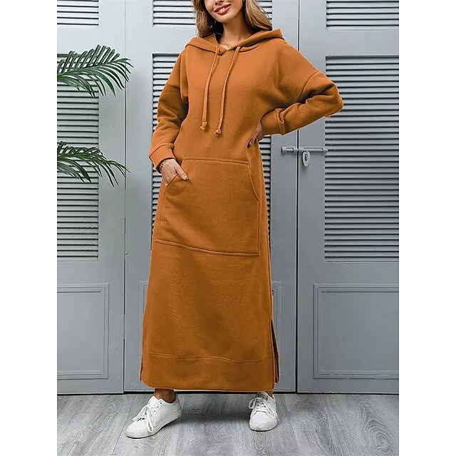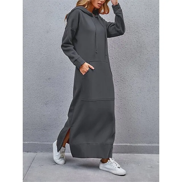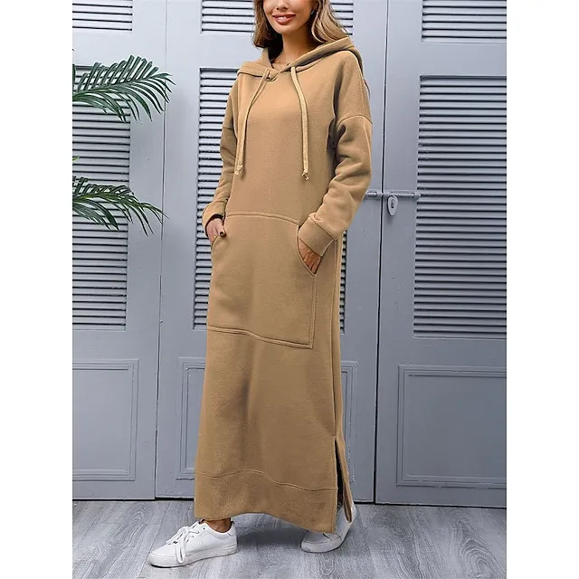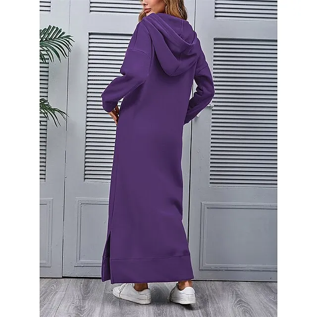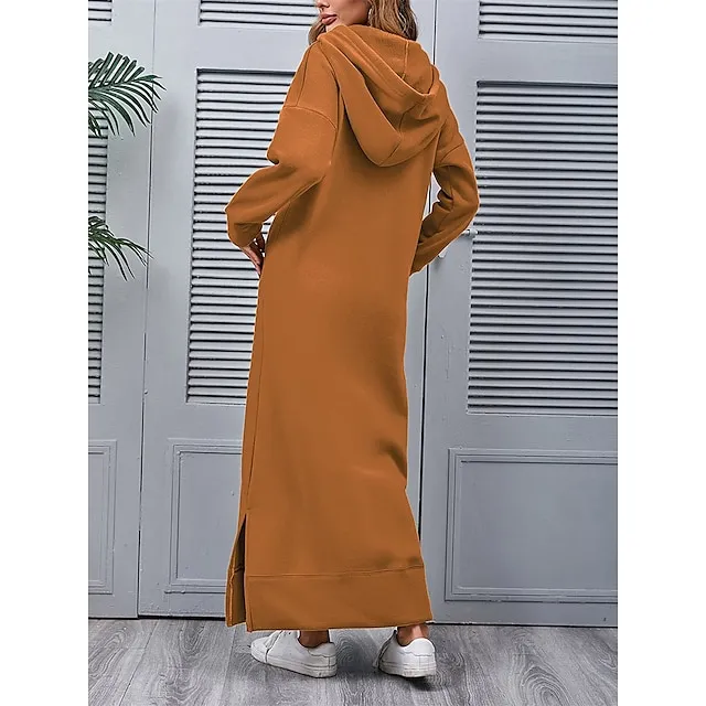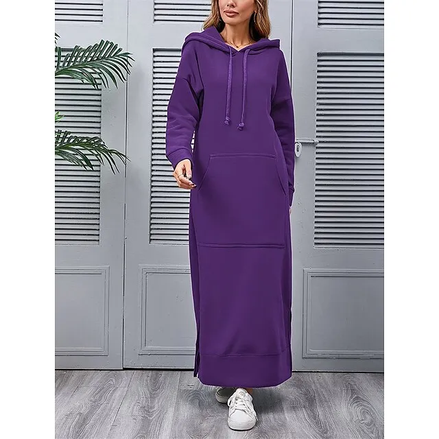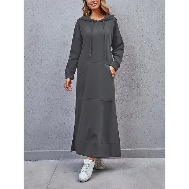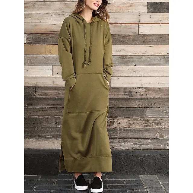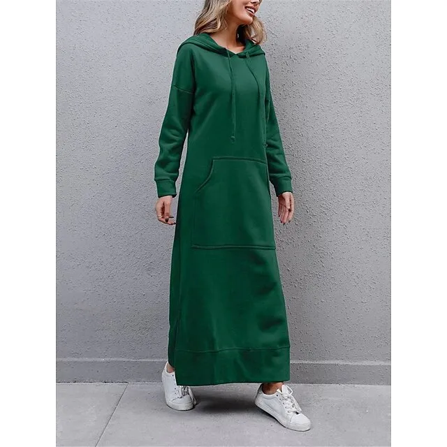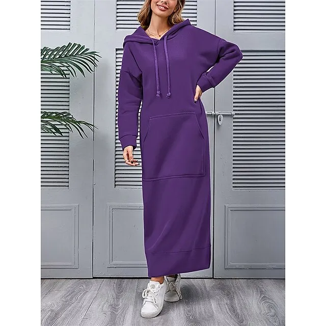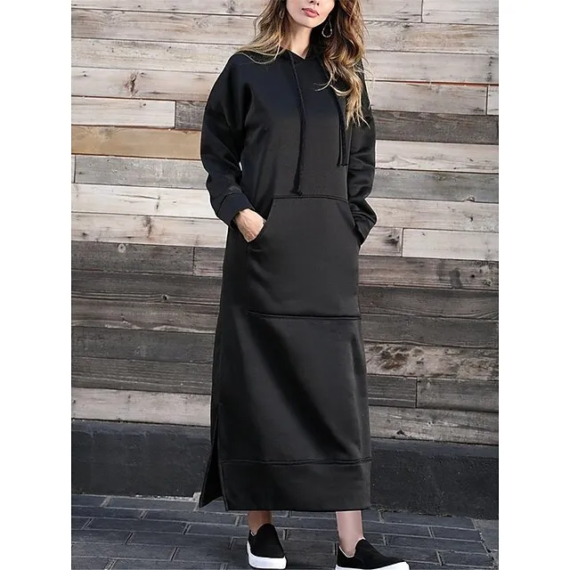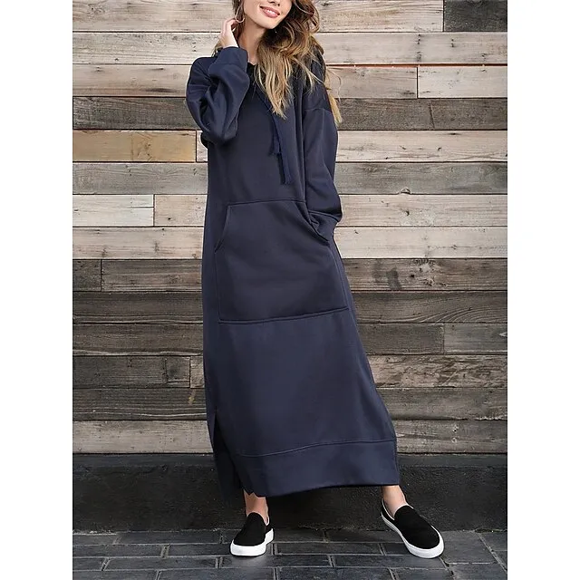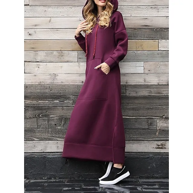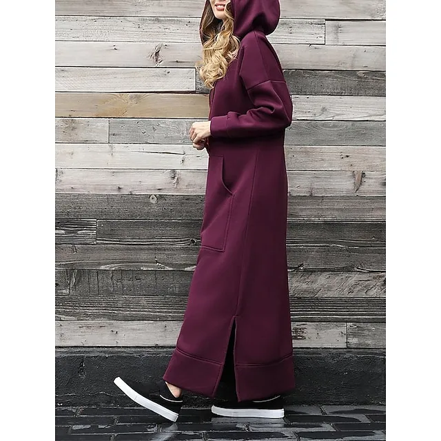 Women’s Casual Dress Hoodie Dress Long Dress Maxi Dress Daily Basic Outdoor Vacation Going out V Neck Pocket Solid Color Regular Fit Black Burgundy Blue S M L XL XXL