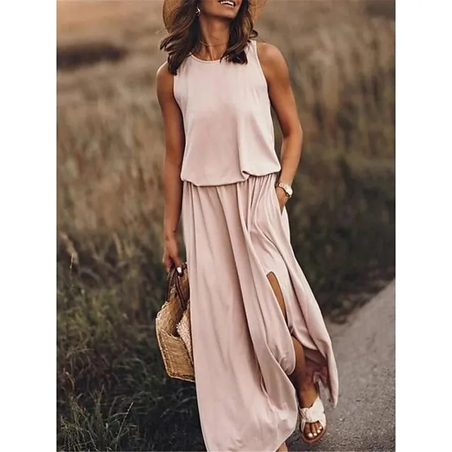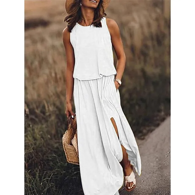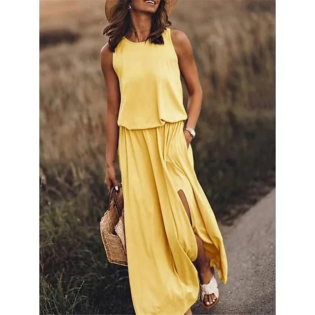 Women’s Casual Dress Tank Dress Summer Dress Long Dress Maxi Dress Pocket Split Street Streetwear Maxi Crew Neck Sleeveless Regular Fit White Yellow Burgundy Color S M L XL 2XL Size