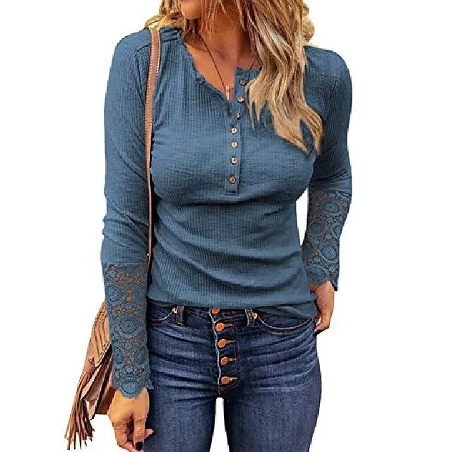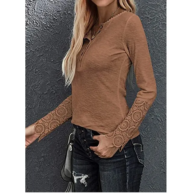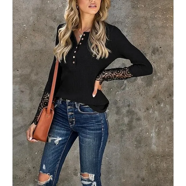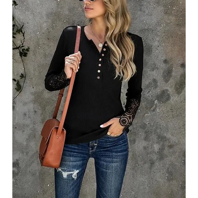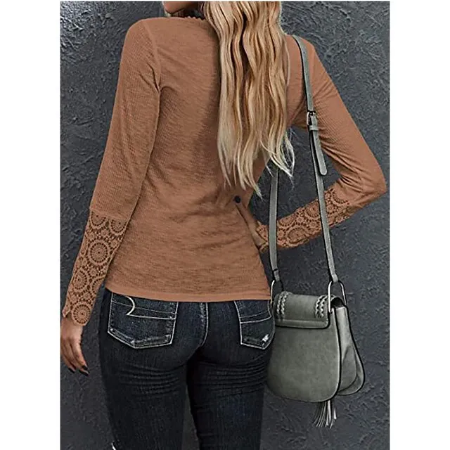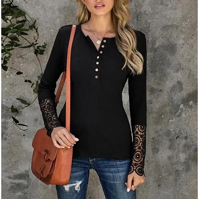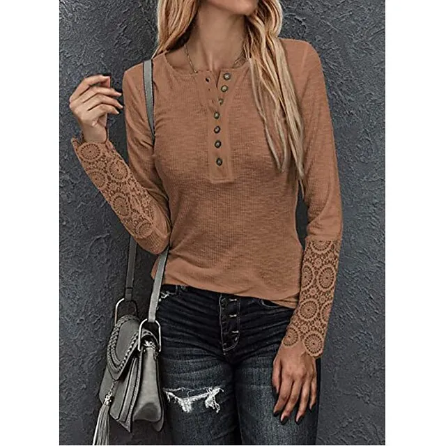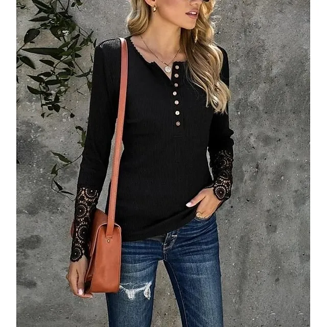 Women’s Henley Shirt Blouse T shirt Tee Almond Black White Plain Lace Button Long Sleeve Casual Daily Basic Round Neck Regular S