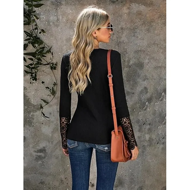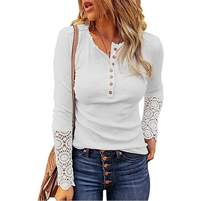 Women’s Shirt Blouse Plain Casual White Blue Lace Patchwork Long Sleeve Fashion V Neck Regular Fit Spring & Fall
