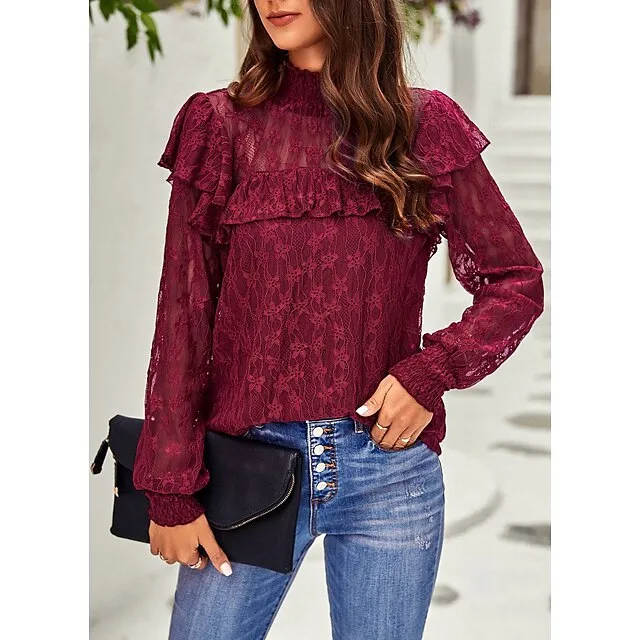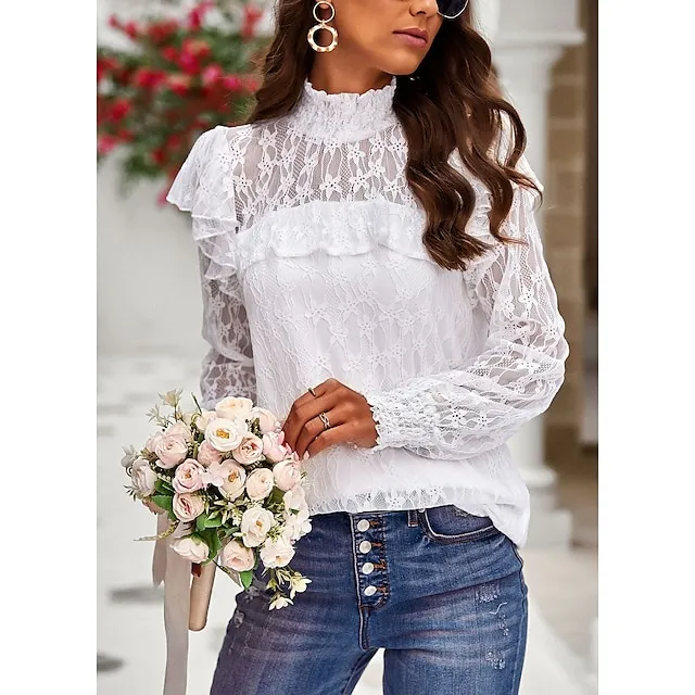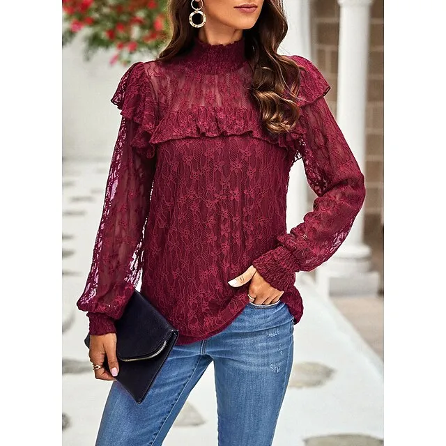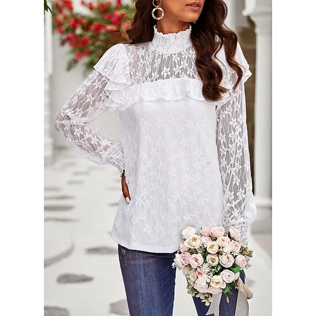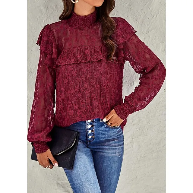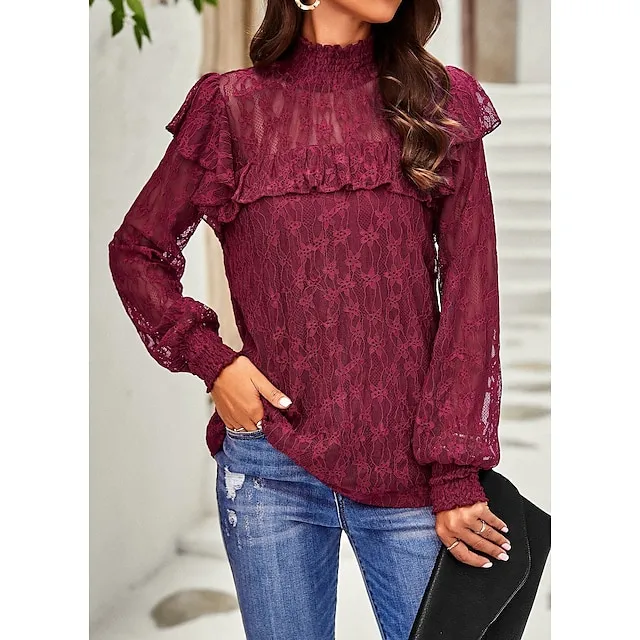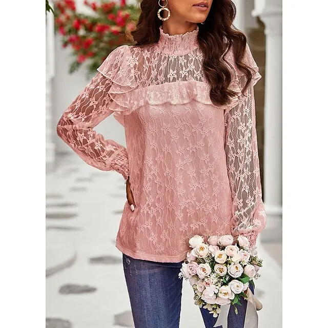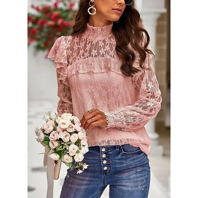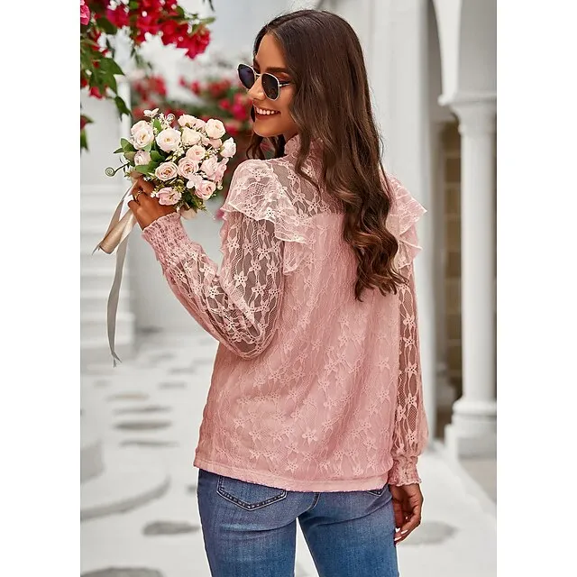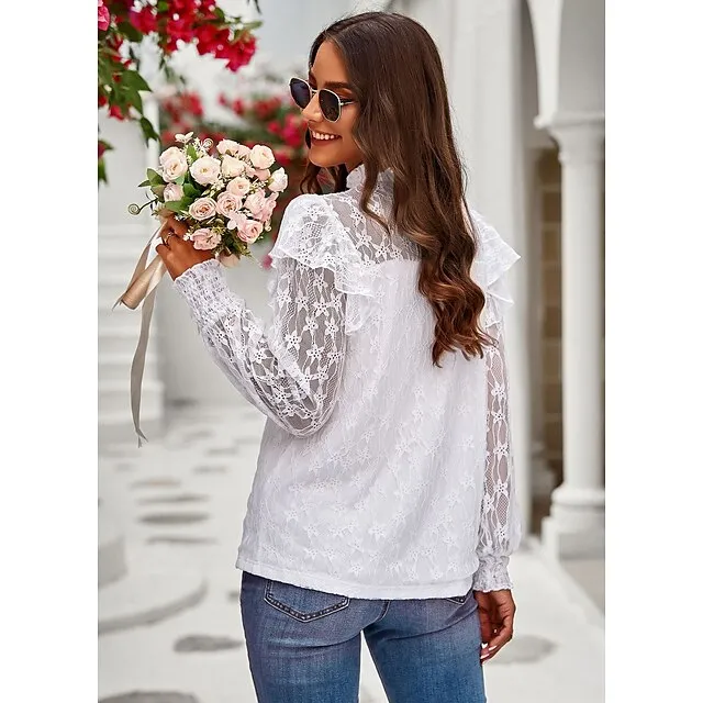 Women’s Lace Shirt Going Out Tops Blouse Plain Sexy Flower Party Holiday Going out Lantern Sleeve White Pink Wine Lace Long Sleeve Fashion Romantic Sexy Turtleneck High Neck Form Fit Spring & Fall