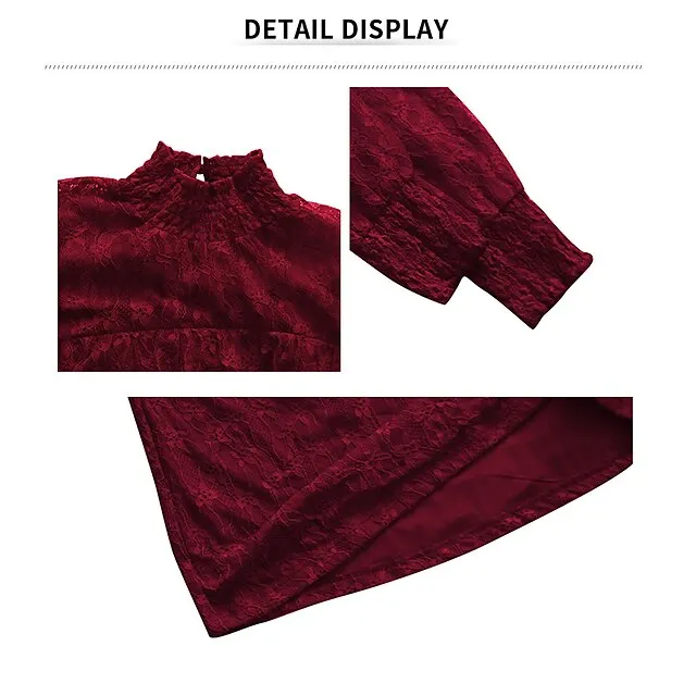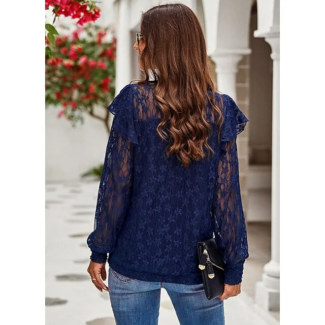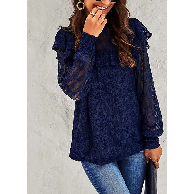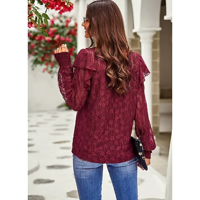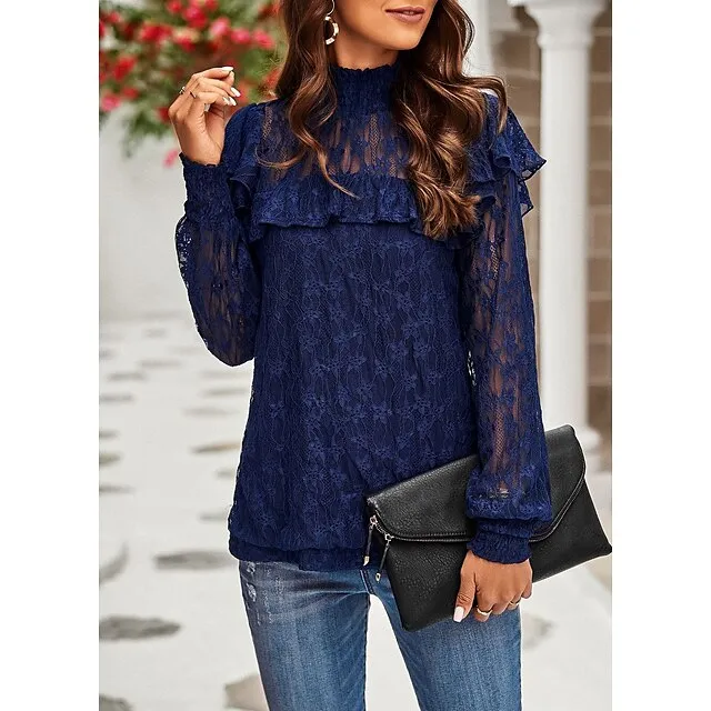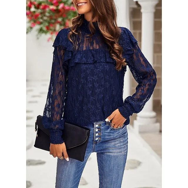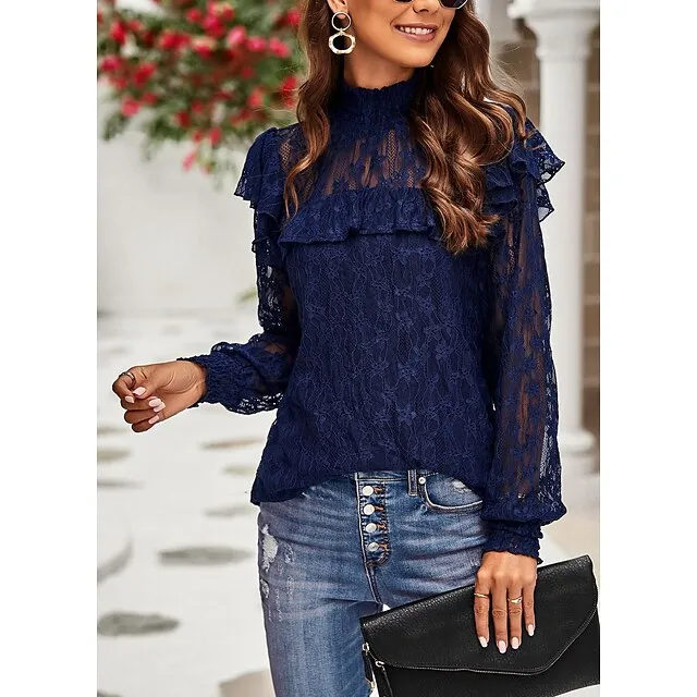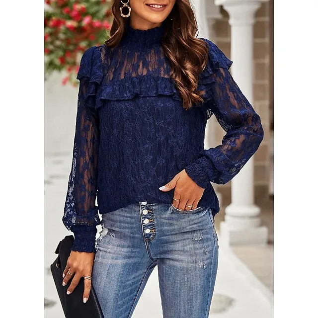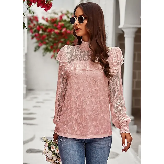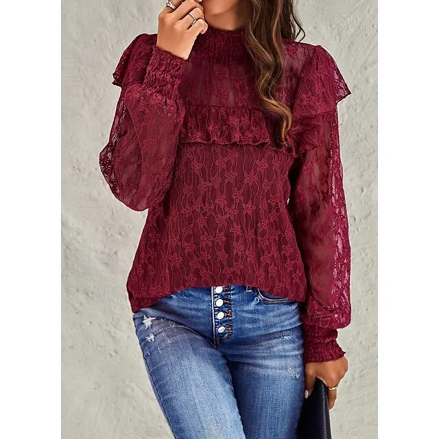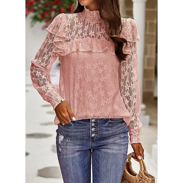 Women’s Lace Shirt Going Out Tops Blouse Plain Sexy Flower Party Holiday Going out Lantern Sleeve White Pink Wine Lace Long Sleeve Fashion Romantic Sexy Turtleneck High Neck Form Fit Spring & Fall
