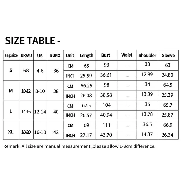 | Size | Fit US Size | Fit UK Size | Fit EU Size | Bust | Sleeve | Shoulder Width | Length |