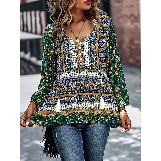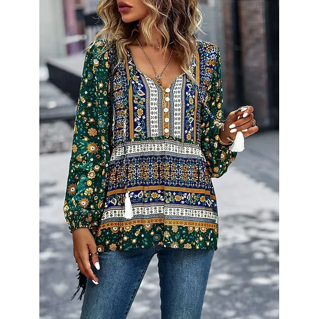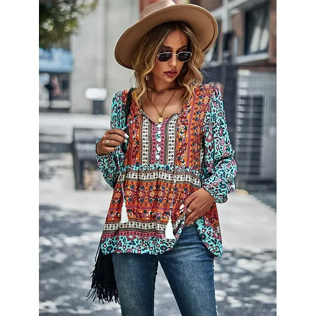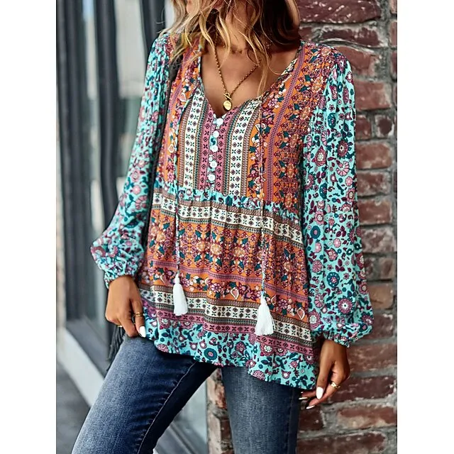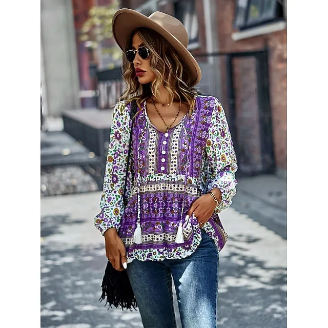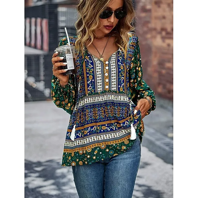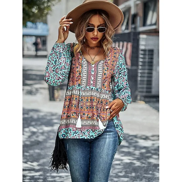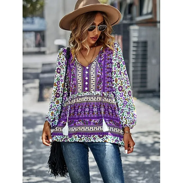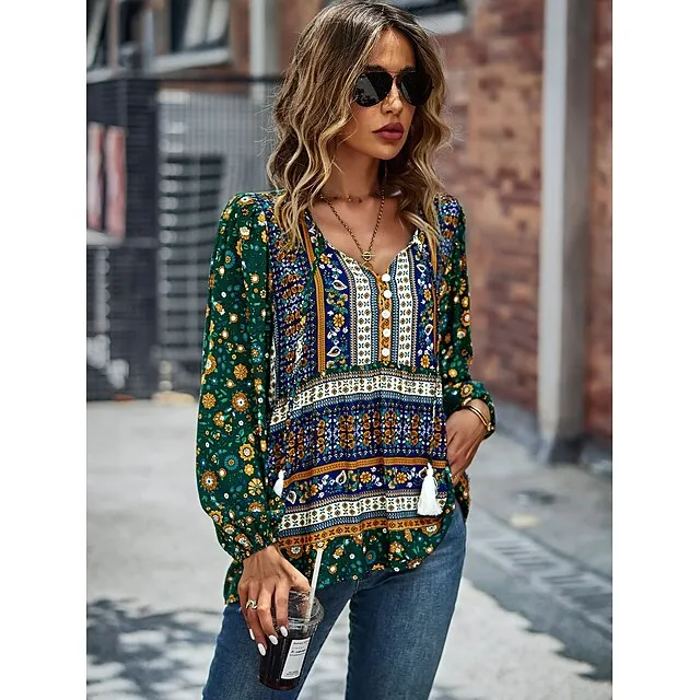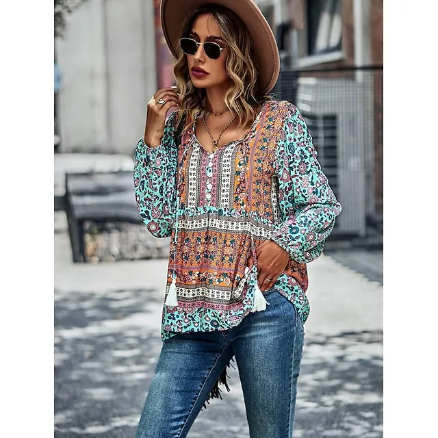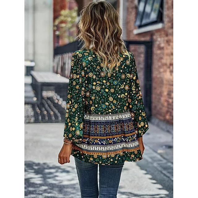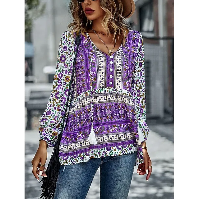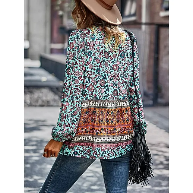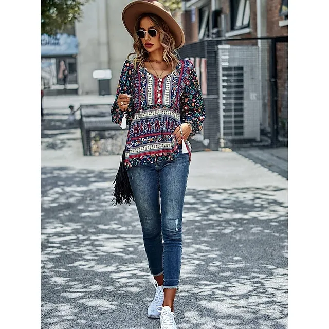 Shirt Blouse Women’s Black Red Blue Floral Lace up Print Casual Holiday Fashion V Neck Regular Fit S