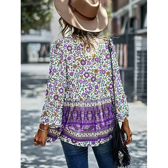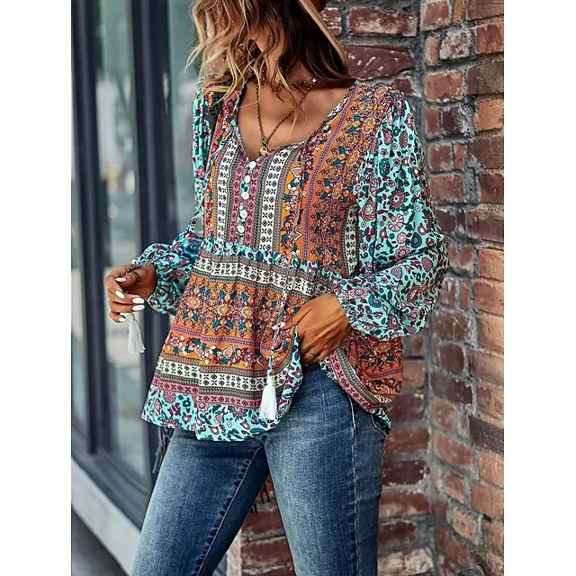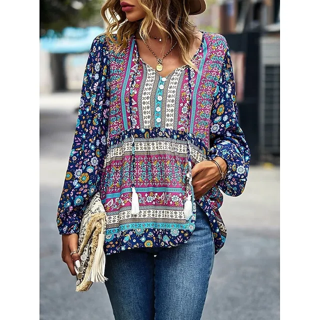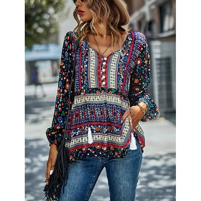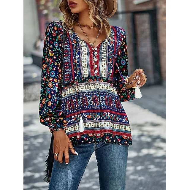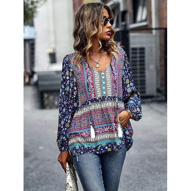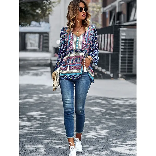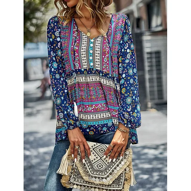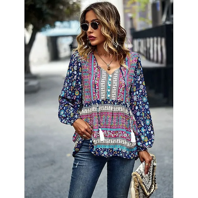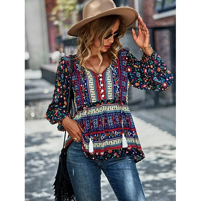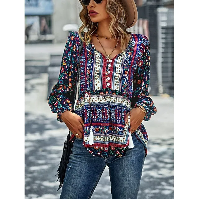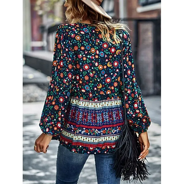 Women’s Lace Shirt Shirt Blouse Floral Casual Holiday Red Navy Blue Blue Print Lace up Long Sleeve Fashion V Neck Regular Fit Spring & Fall