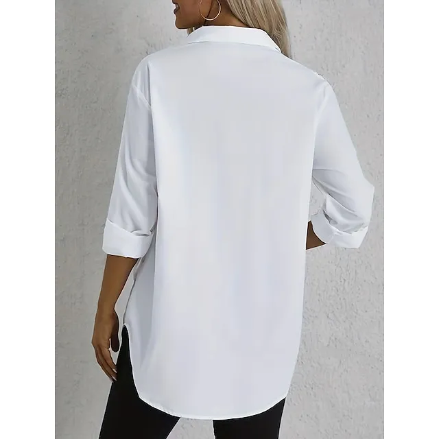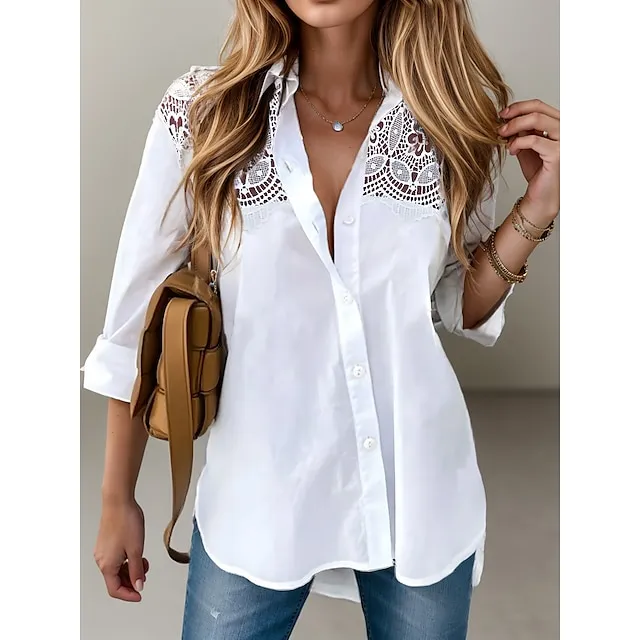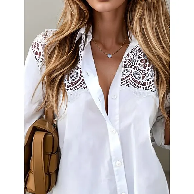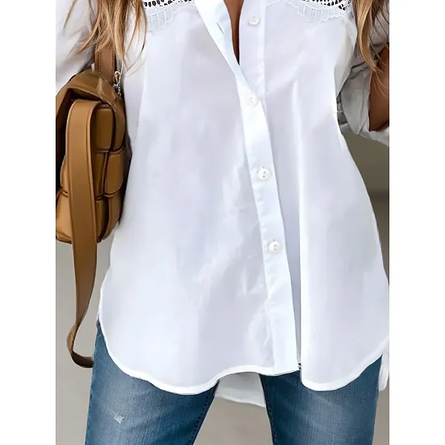 Women’s Lace Shirt Shirt Blouse Plain White Lace Patchwork Button Long Sleeve Work Going out Fashion Modern Shirt Collar Regular Fit Spring