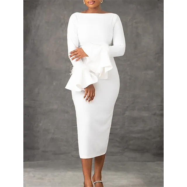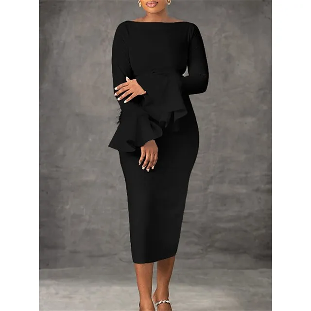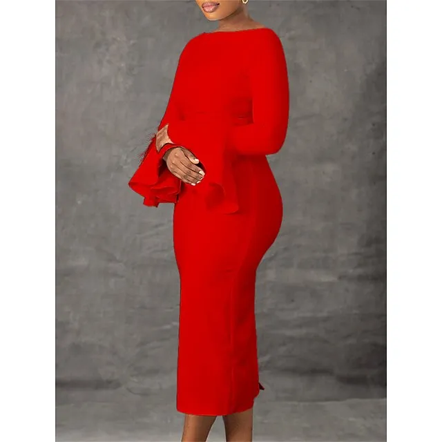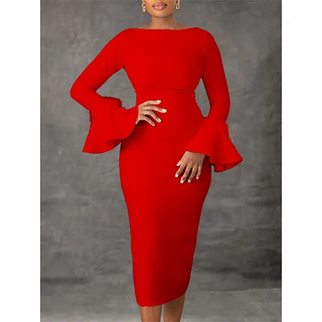 Women’s Party Dress Feather Dress Cocktail Dress Midi Dress Black White Red Long Sleeve Plain Feather Summer Spring Fall Crew Neck Party Winter Dress Wedding Guest Birthday S M L XL XXL 3XL