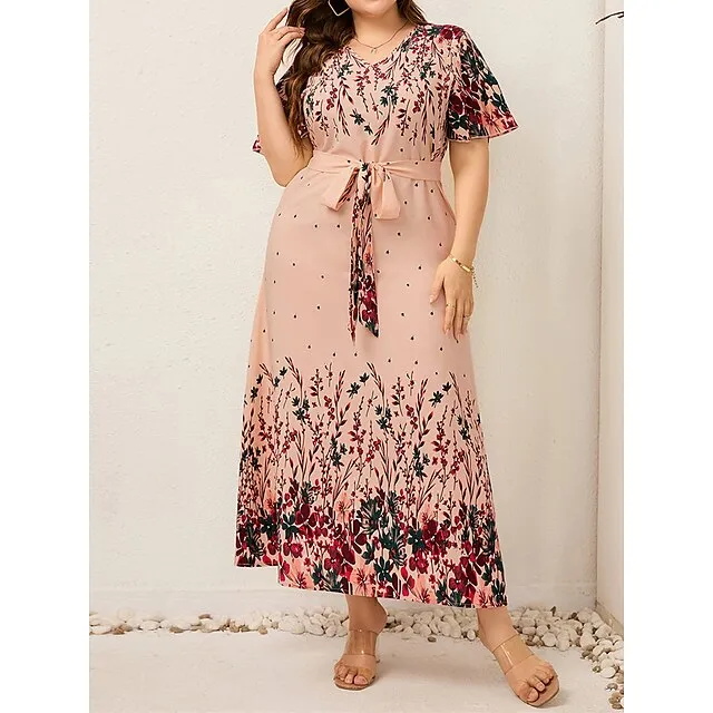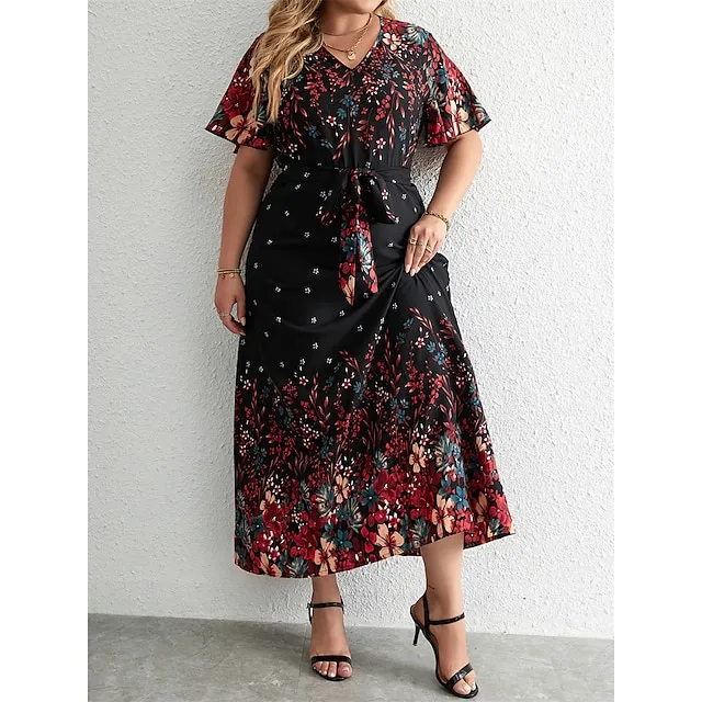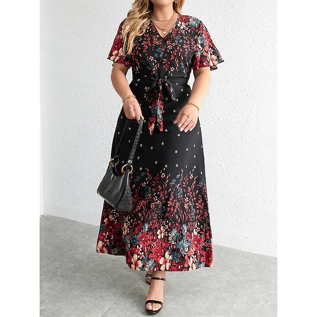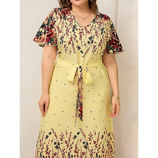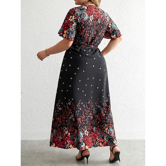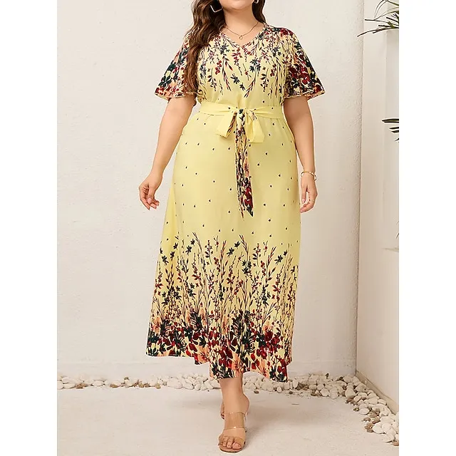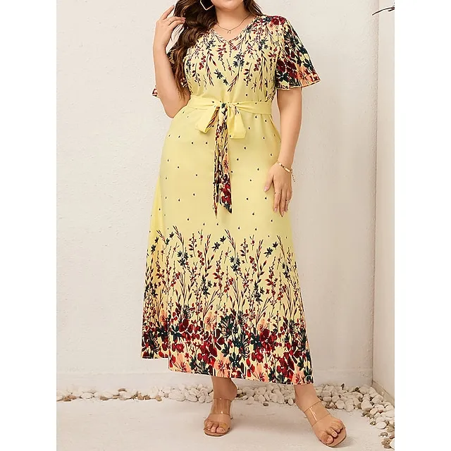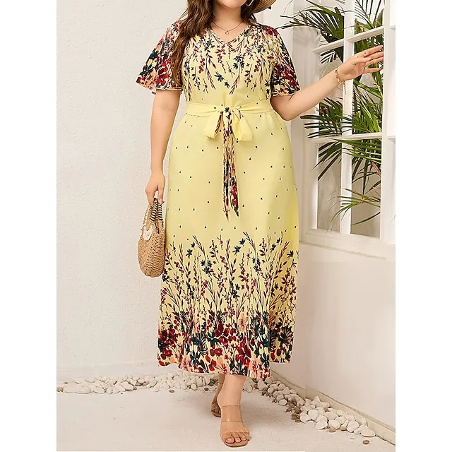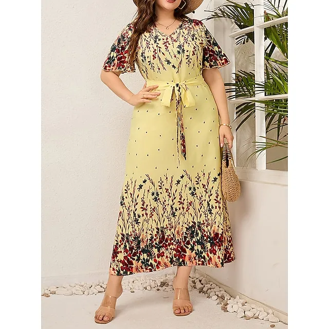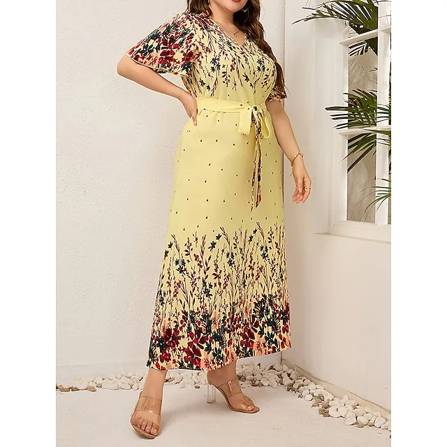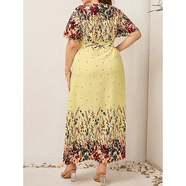 Women’s Plus Size Prom Dress Party Dress Wedding Guest Dress Long Dress Maxi Dress Black Yellow Pink Short Sleeve Floral Print Summer Spring Fall V Neck Elegant Wedding Guest Birthday Evening Party