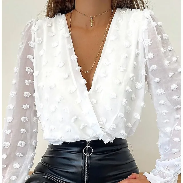 Women’s Shirt Blouse Eyelet top Peasant Blouse Black White Khaki Graphic Floral Lace Long Sleeve Casual Daily Basic Elegant Casual V Neck Regular Floral Puff Sleeve S
