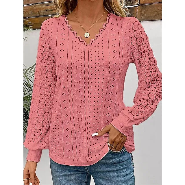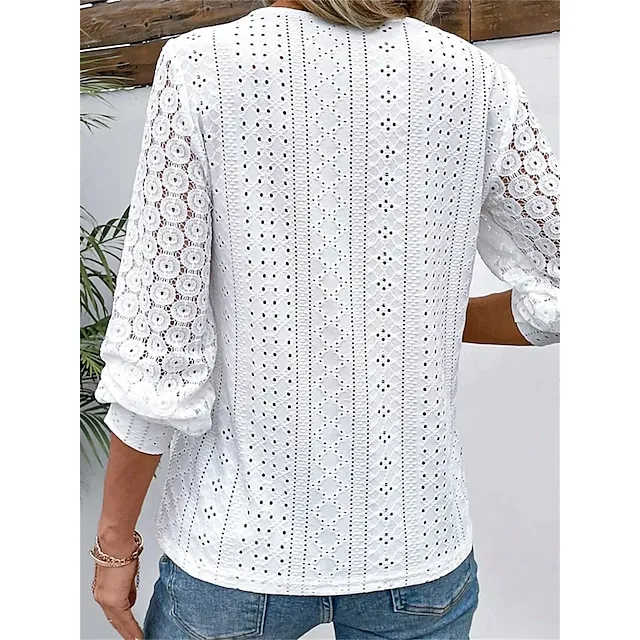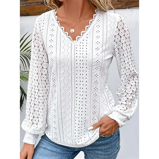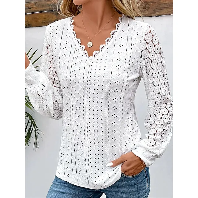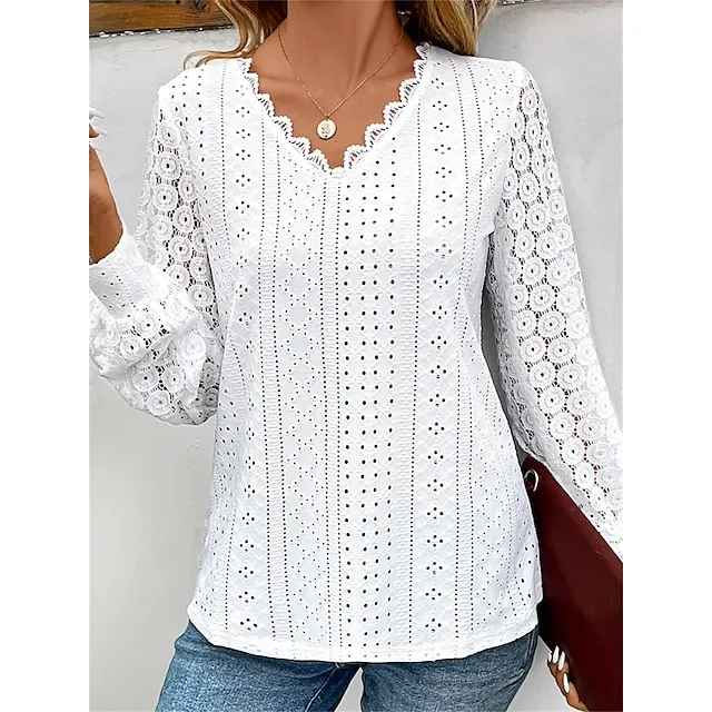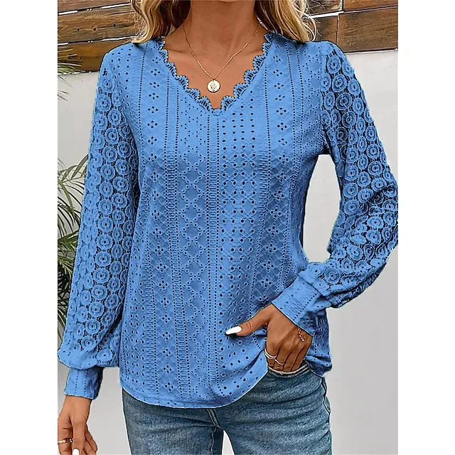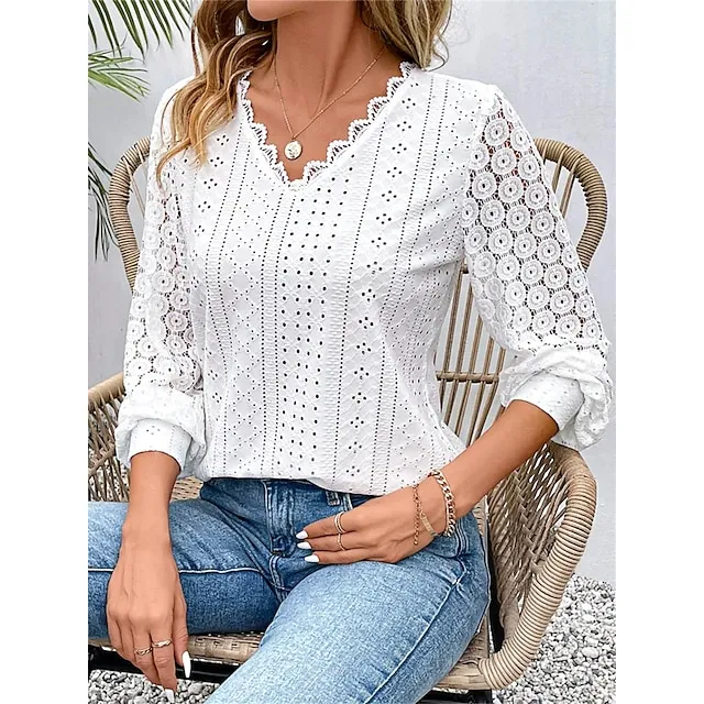 Women’s Shirt Blouse Plain Casual White Blue Lace Patchwork Long Sleeve Fashion V Neck Regular Fit Spring & Fall