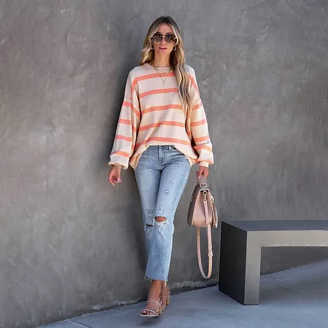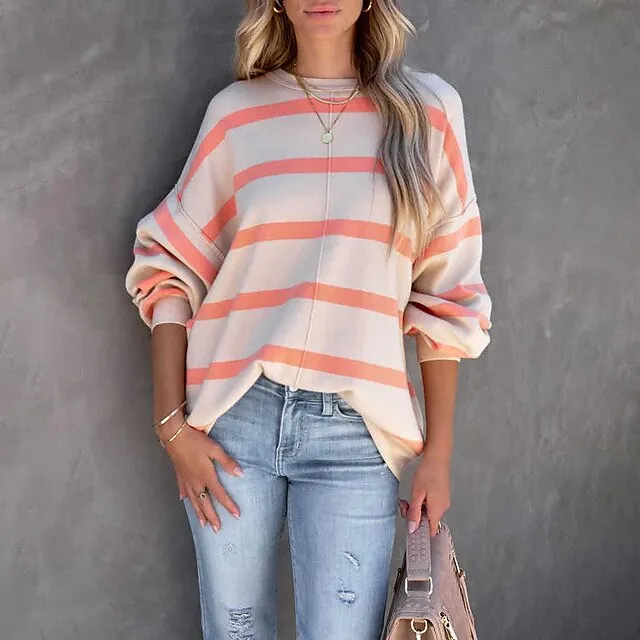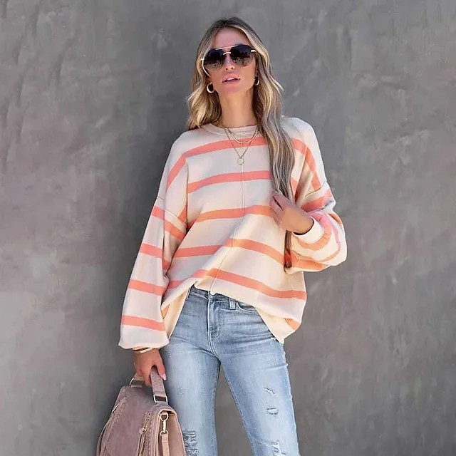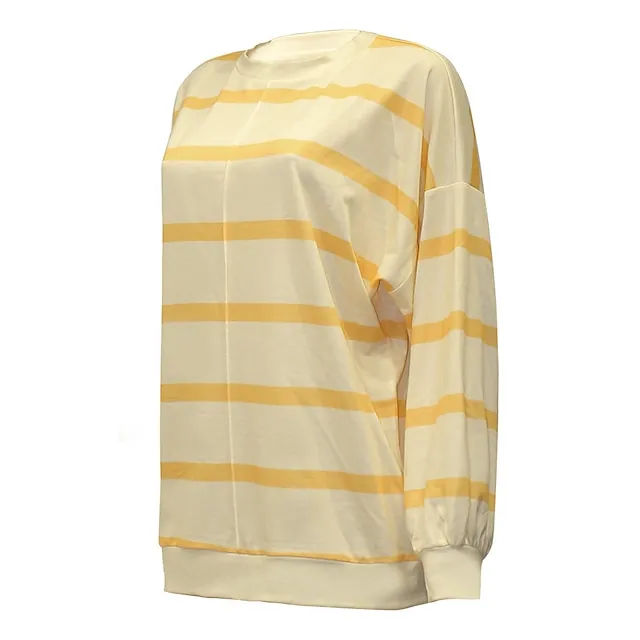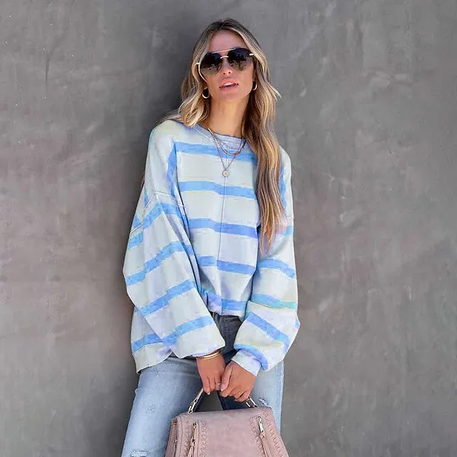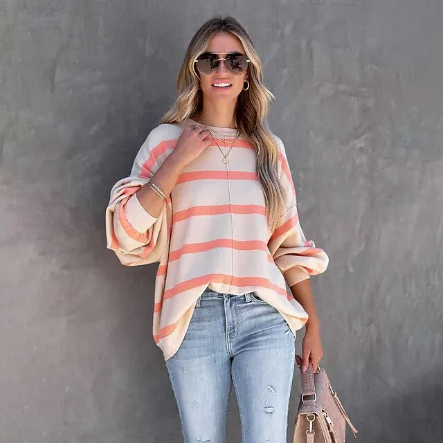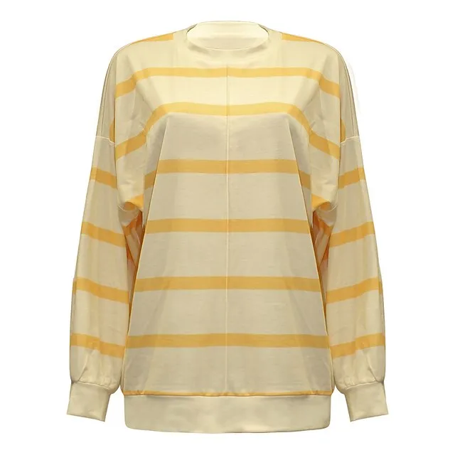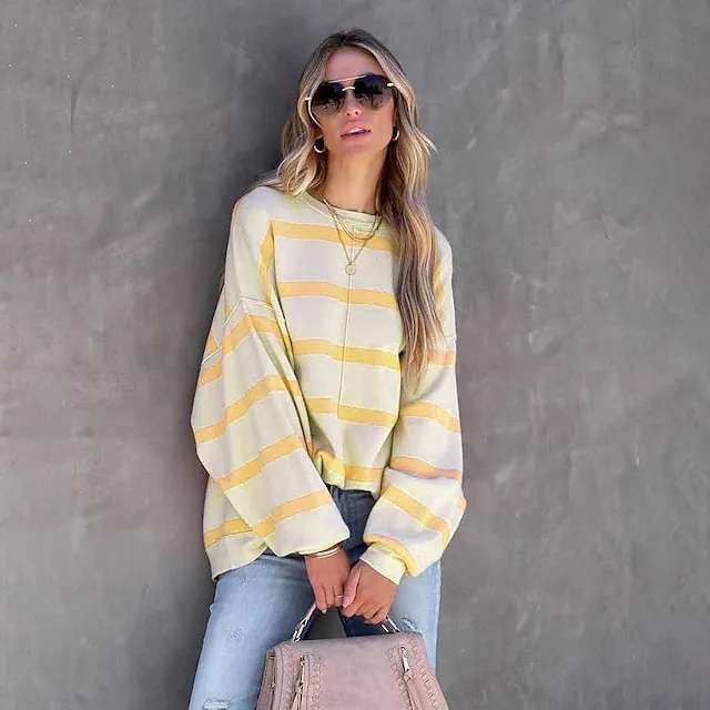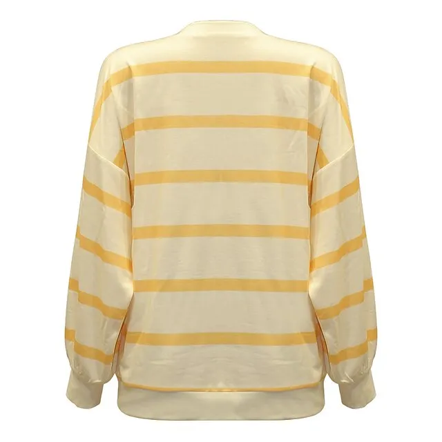 Women’s Shirt Blouse Striped Casual Yellow Pink Blue Print Long Sleeve Fashion Round Neck Loose Fit Spring & Fall