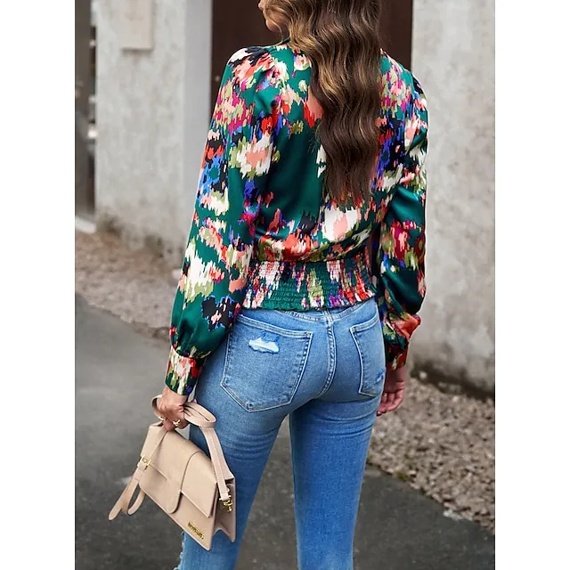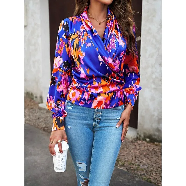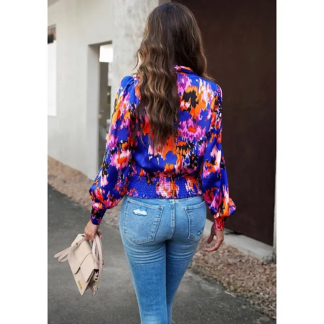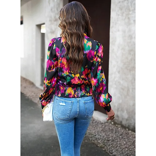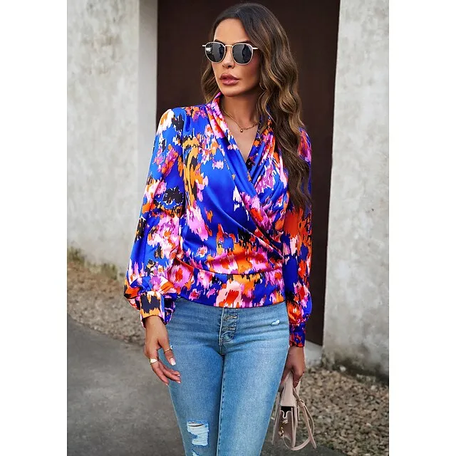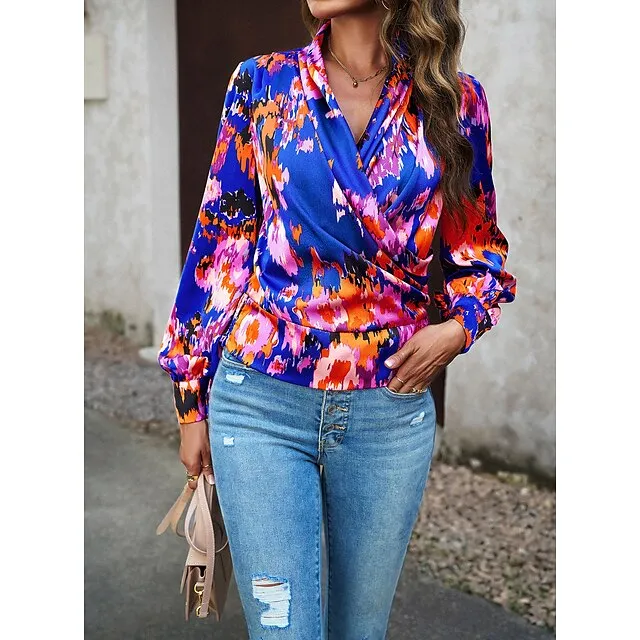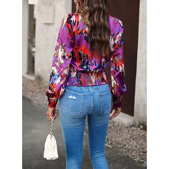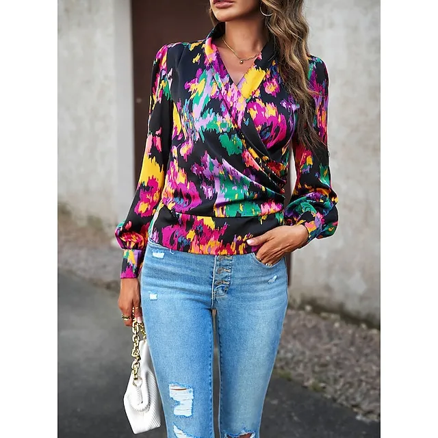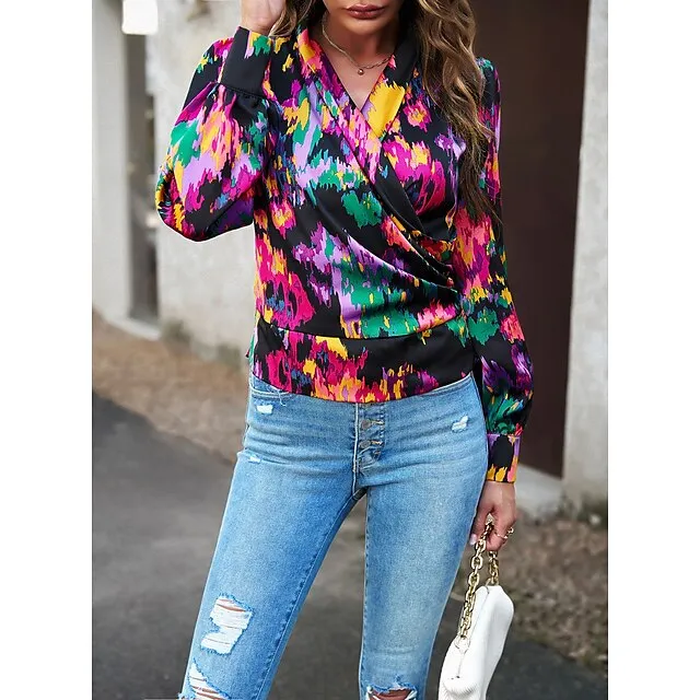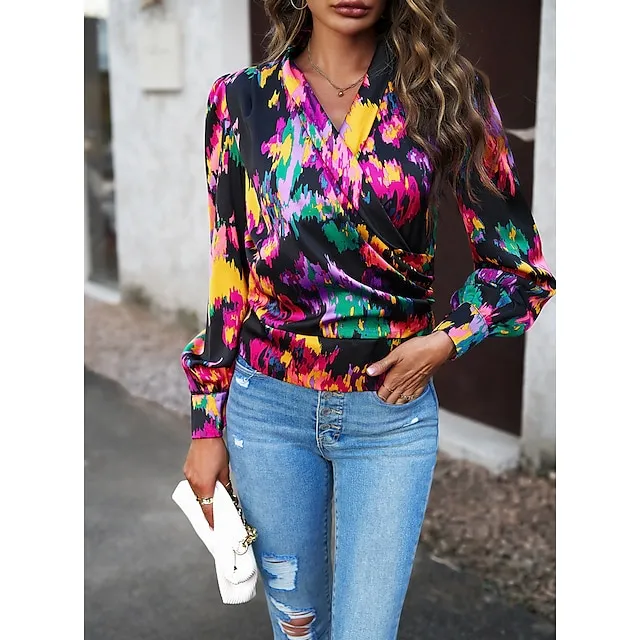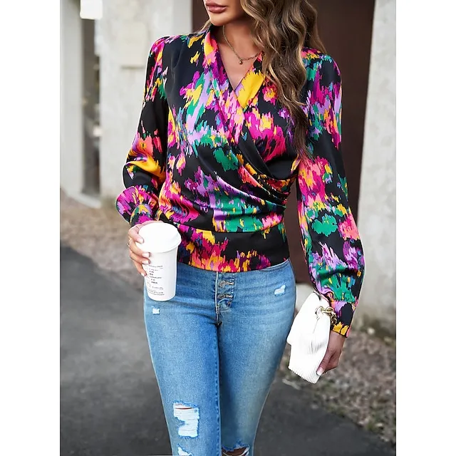 Women’s Shirt Blouse Tie Dye Casual Black Blue Print Long Sleeve Fashion V Neck Regular Fit Spring & Fall