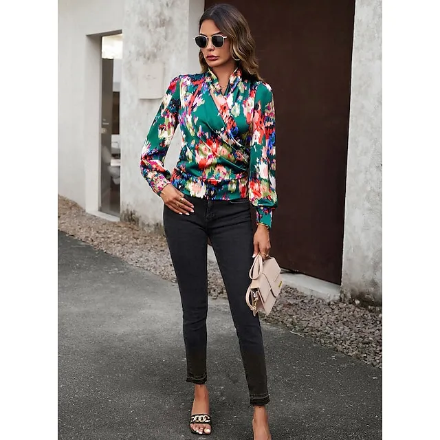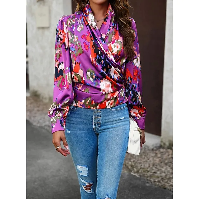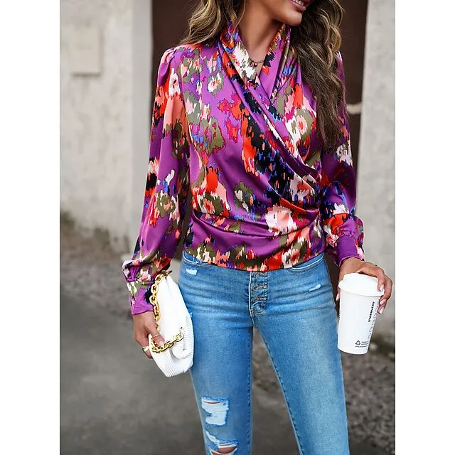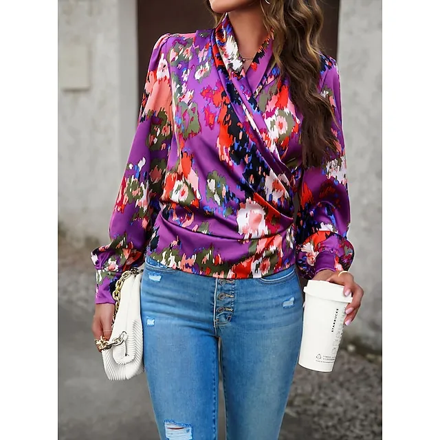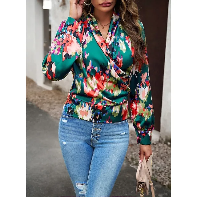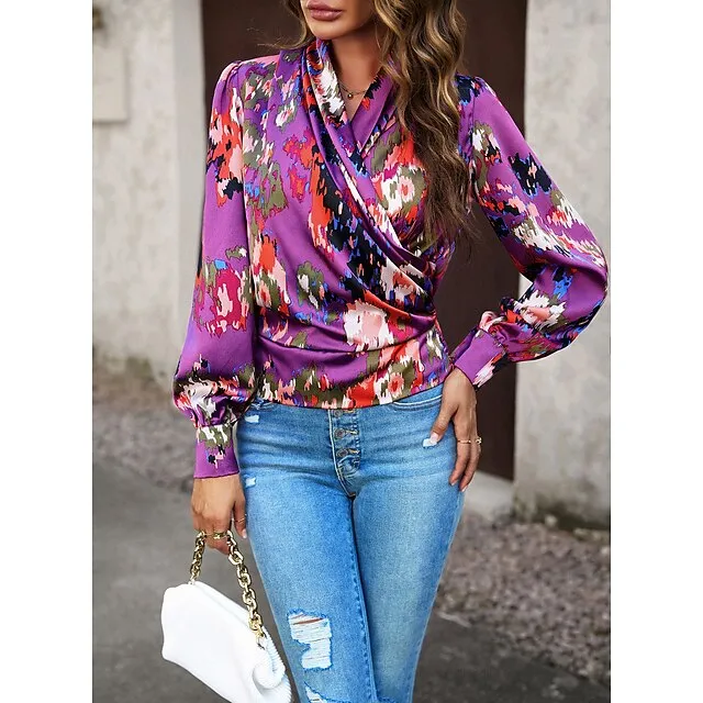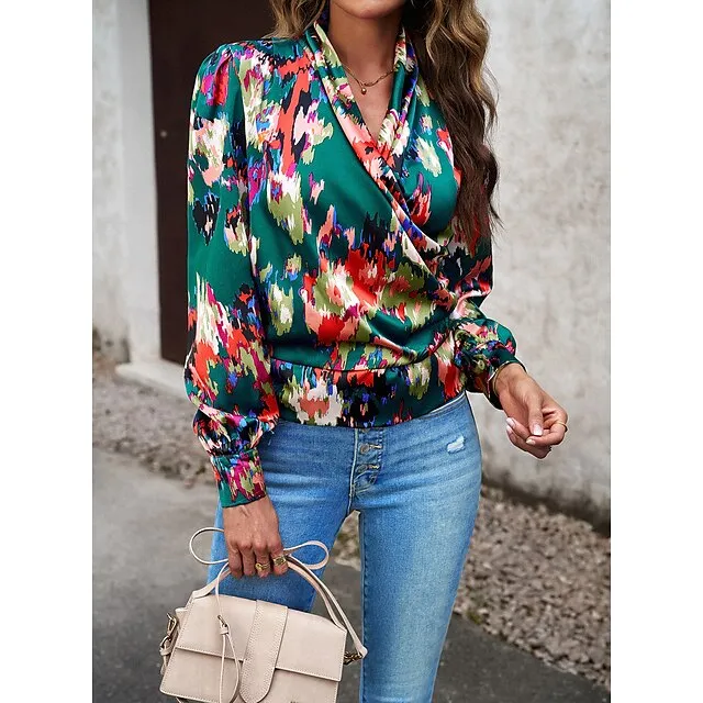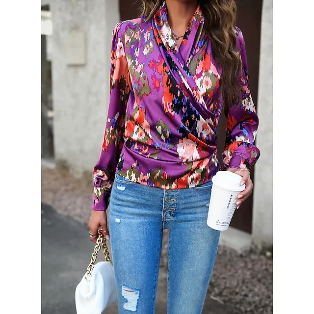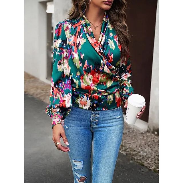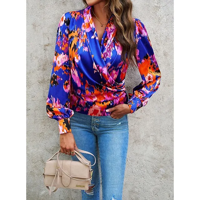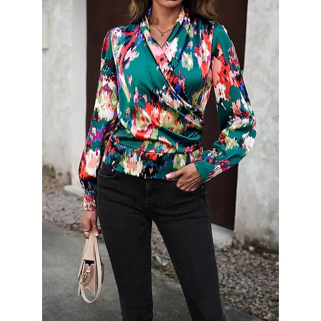 Women’s Shirt Blouse Tie Dye Casual Black Blue Print Long Sleeve Fashion V Neck Regular Fit Spring & Fall