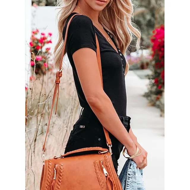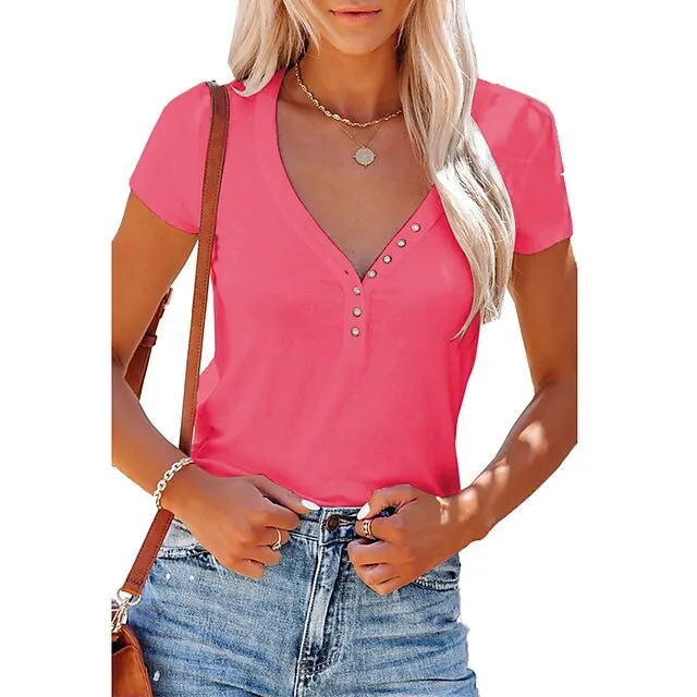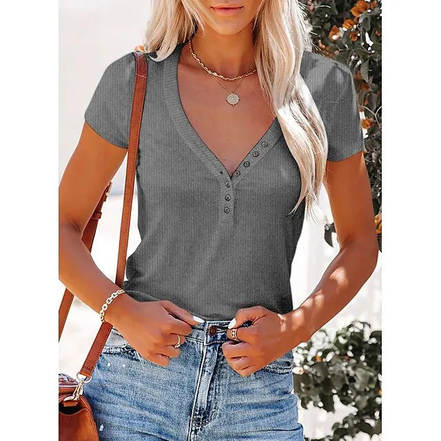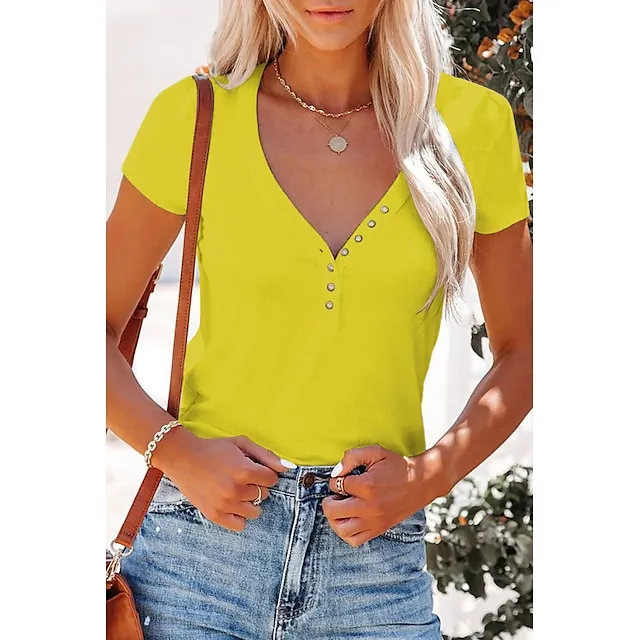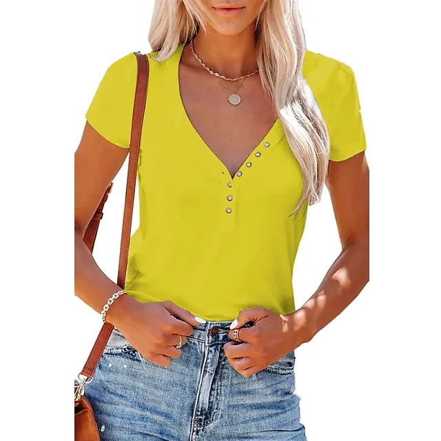 Women’s T shirt Tee Henley Shirt Plain Casual Weekend Black White Yellow Button Short Sleeve Basic V Neck Regular Fit