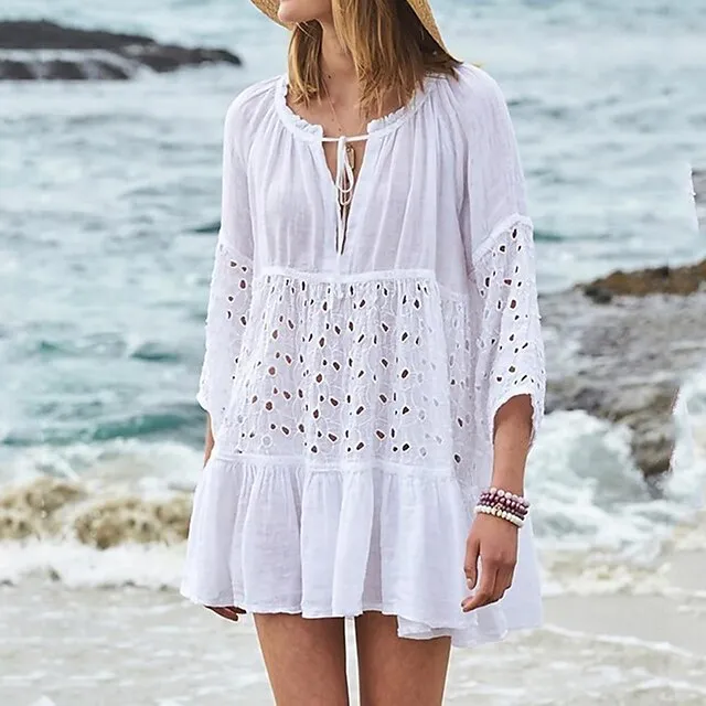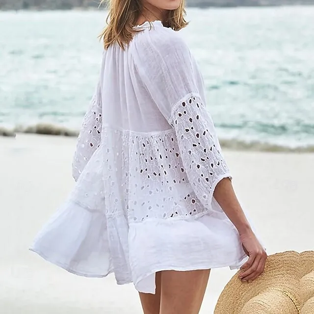 Women’s White Dress Casual Dress Summer Dress Mini Dress Lace up Ruffle Holiday Vacation Beach Basic Round Neck 3/4 Length Sleeve Loose Fit White Color One-Size Size
