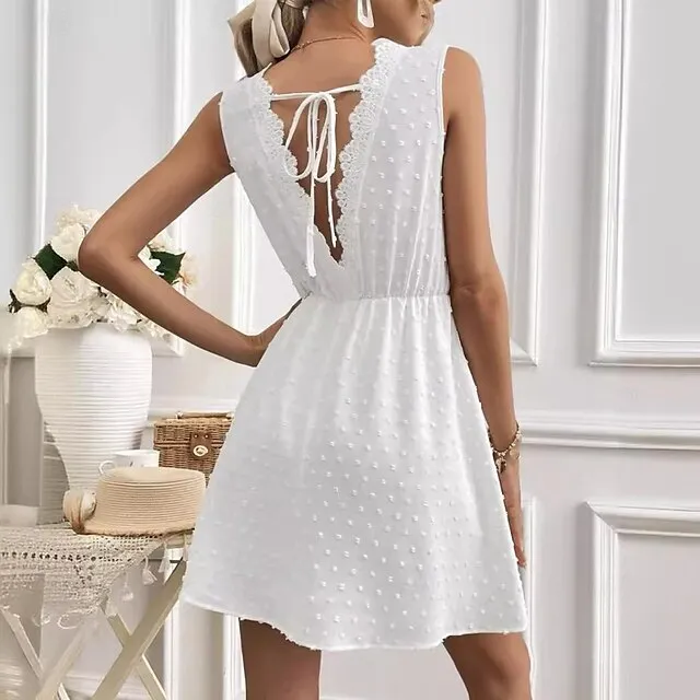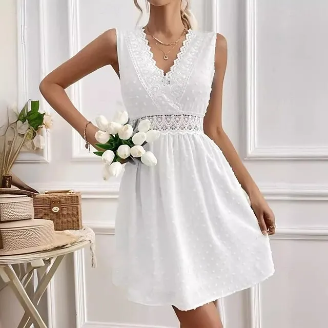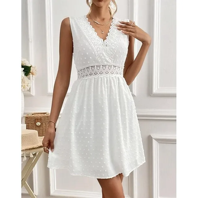 Women’s White Dress Lace Dress Summer Dress Mini Dress Lace Street Date Streetwear V Neck Sleeveless Regular Fit White Color S M L XL 2XL Size